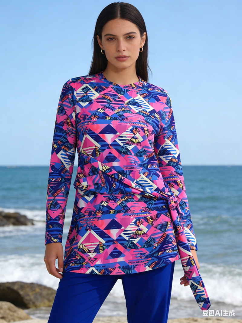 新款长袖印花防晒泳衣女分体两件套保守沙滩温泉度假时尚游泳套装