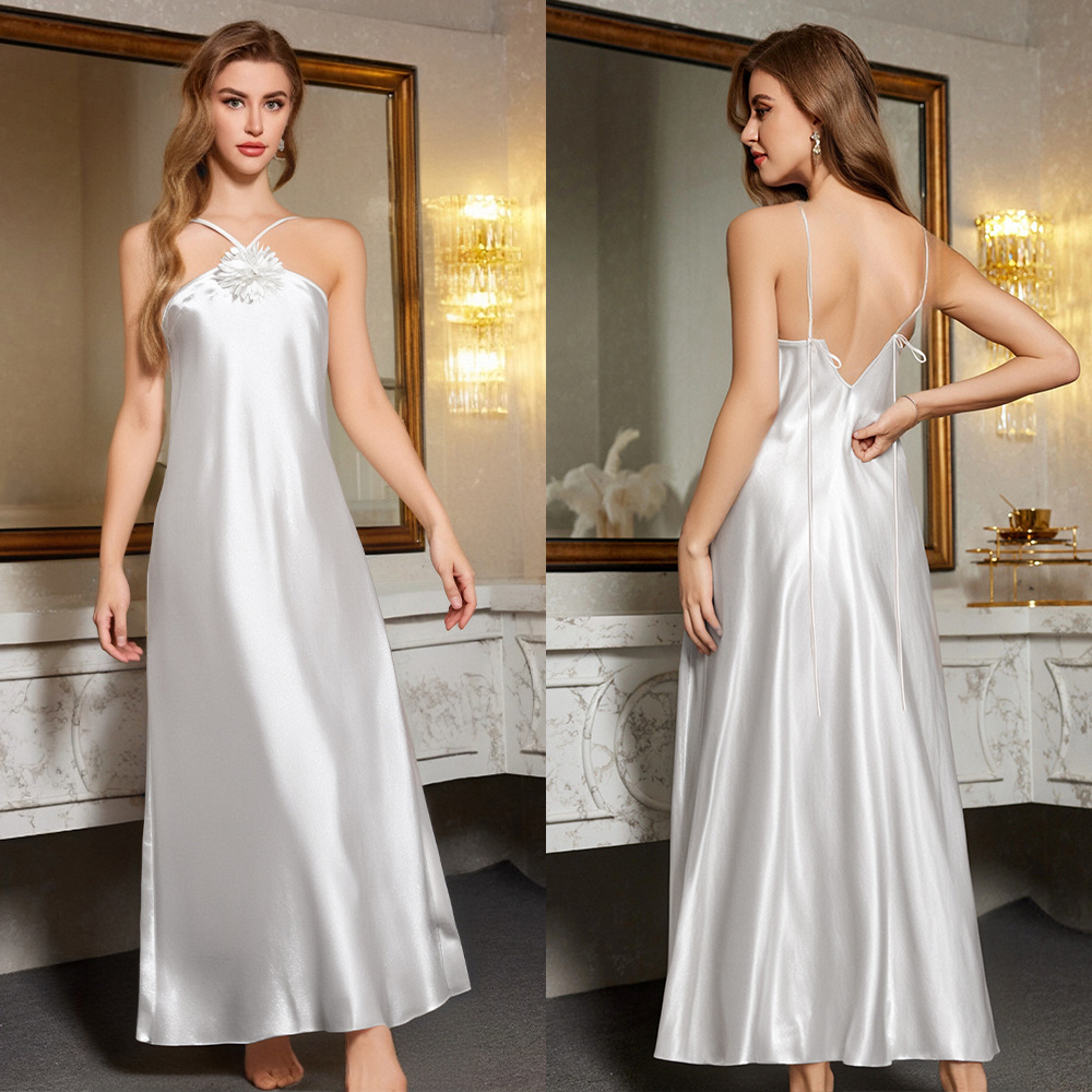 跨境新款睡衣女夏欧美风白色挂脖长吊带露背性感睡裙