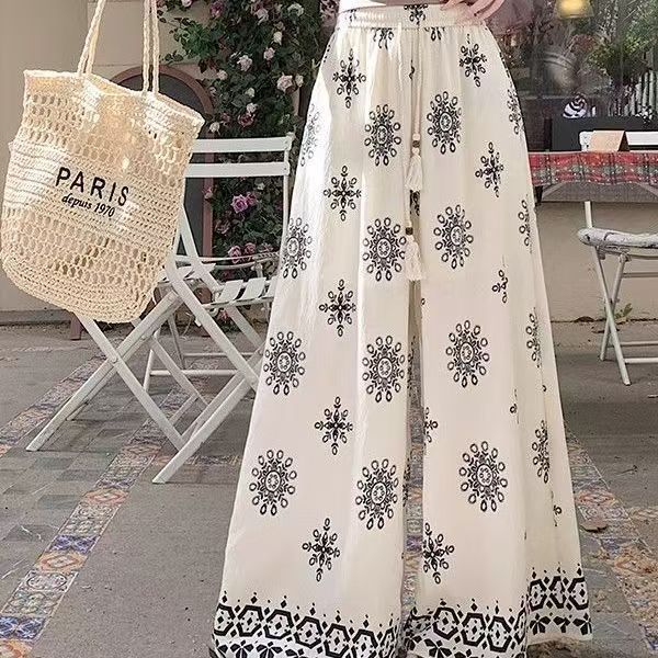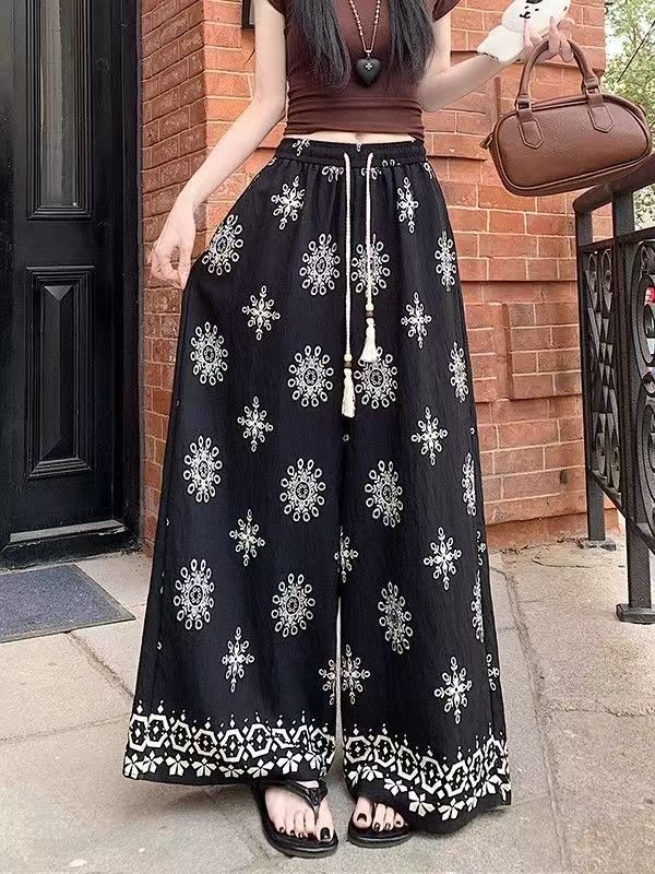 夏季新大码民族风宽松遮肉显瘦阔腿长裤女胖mm休闲波西米亚直筒裤