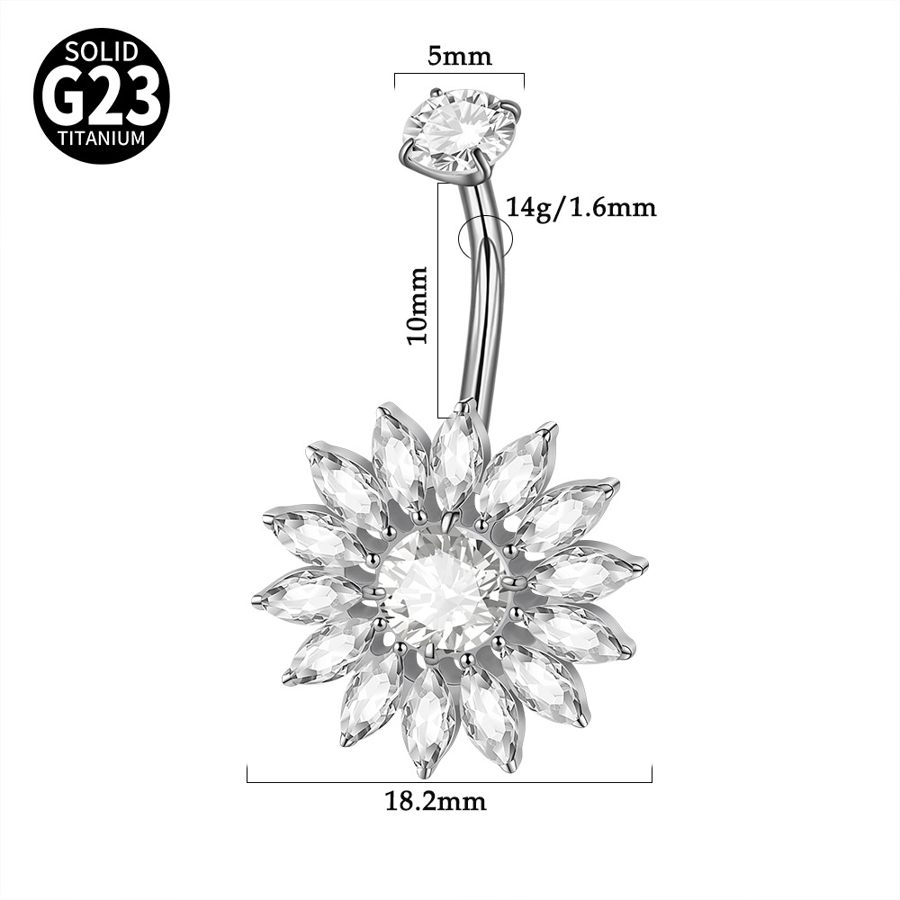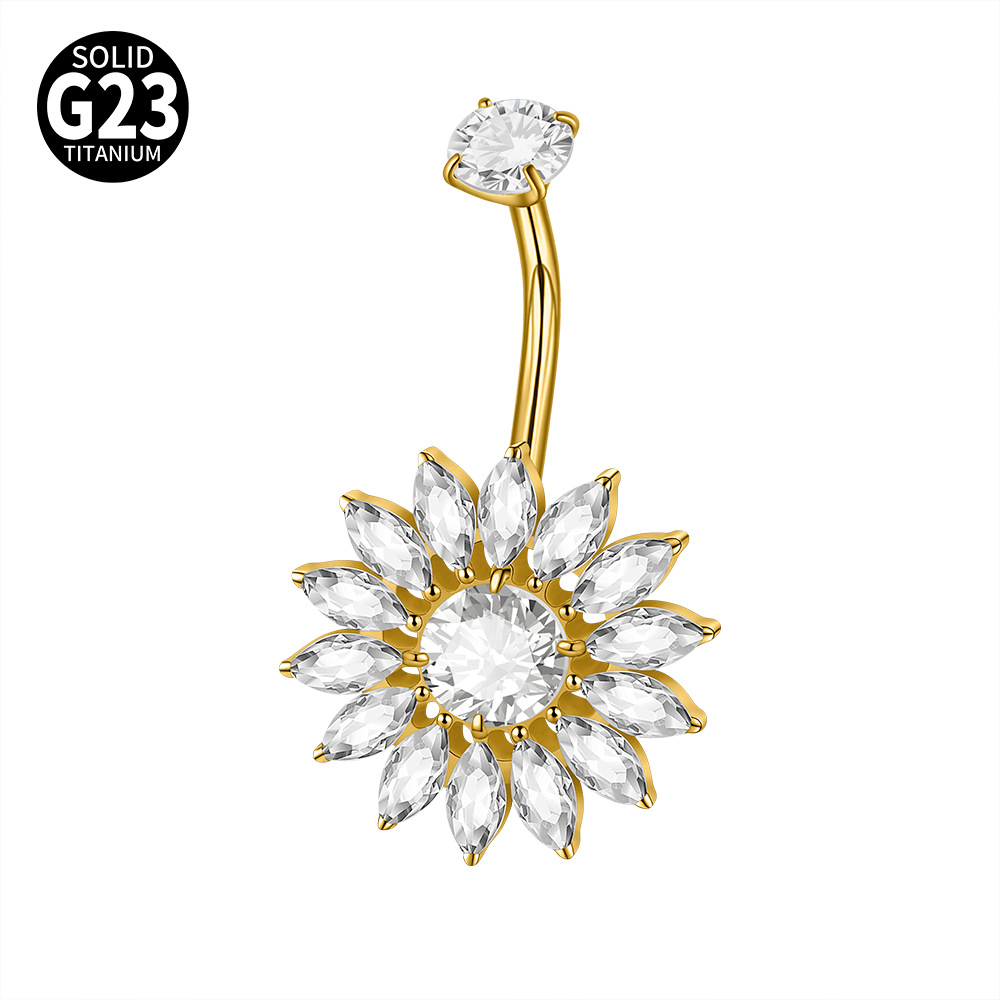 跨境F136钛合金电镀太阳花肚脐环精镶锆石花朵内牙肚脐钉穿刺脐钉