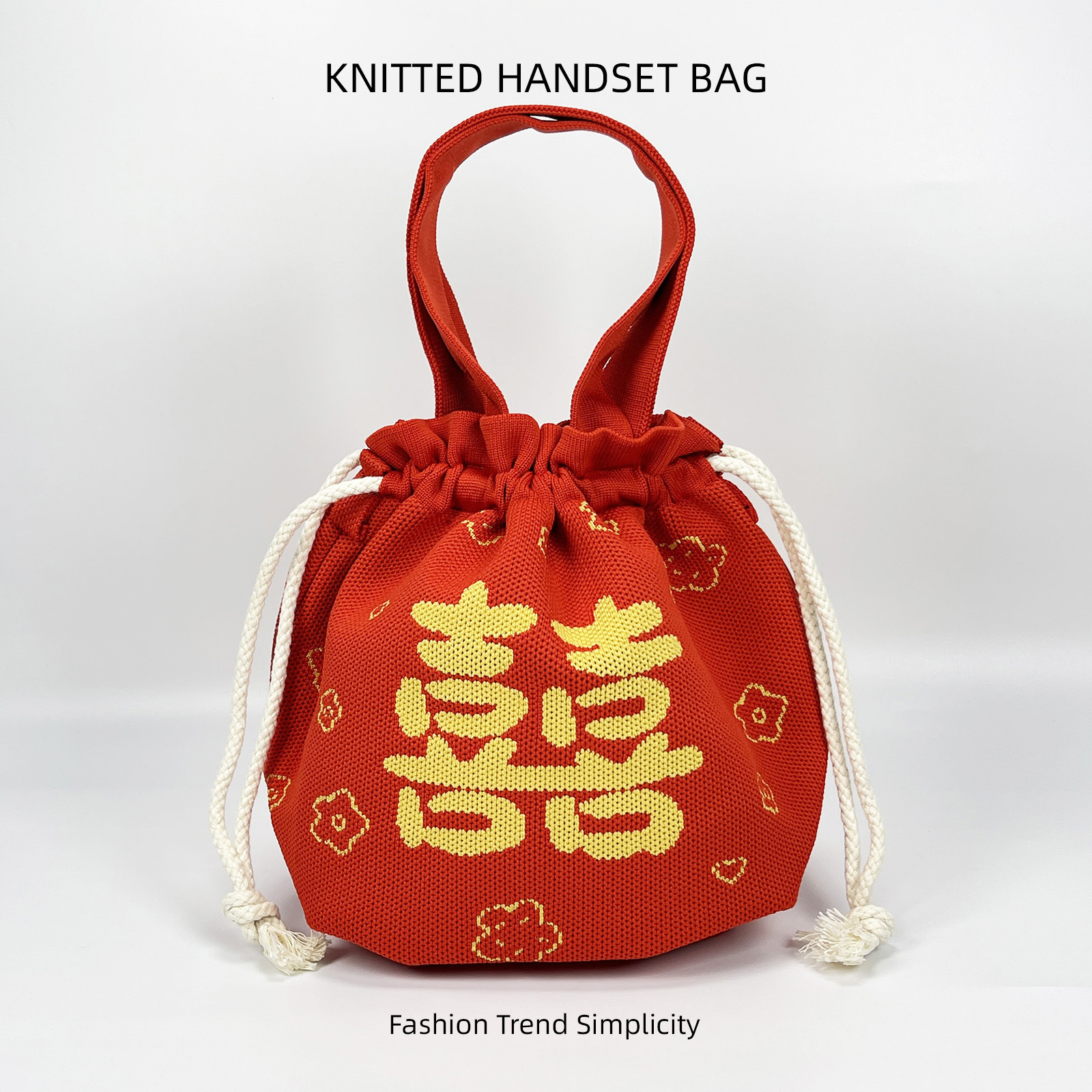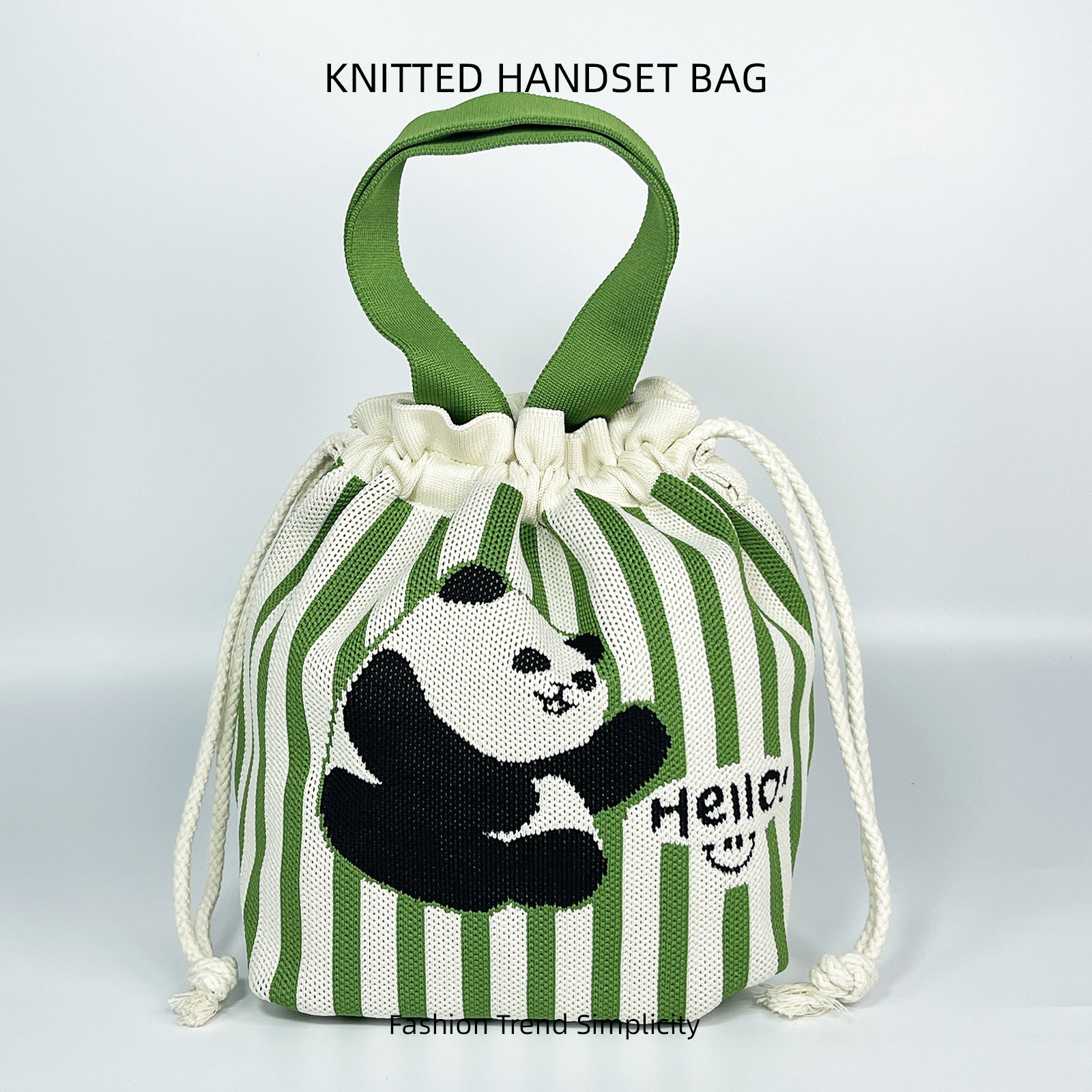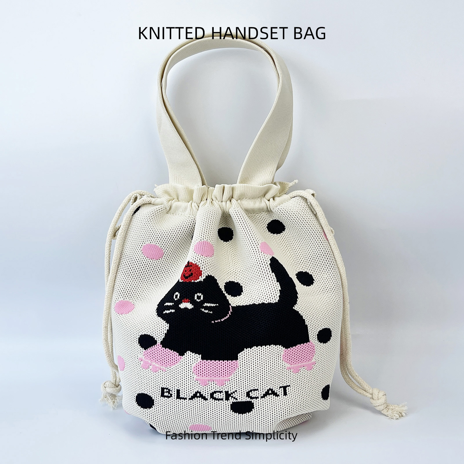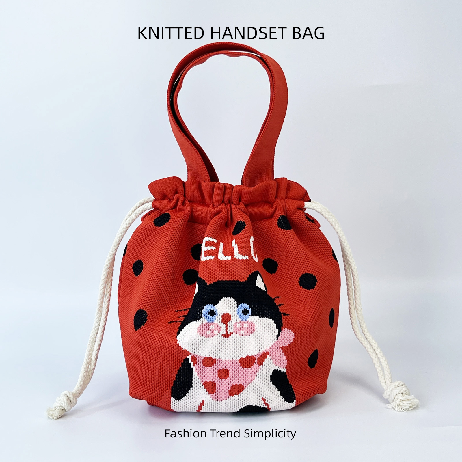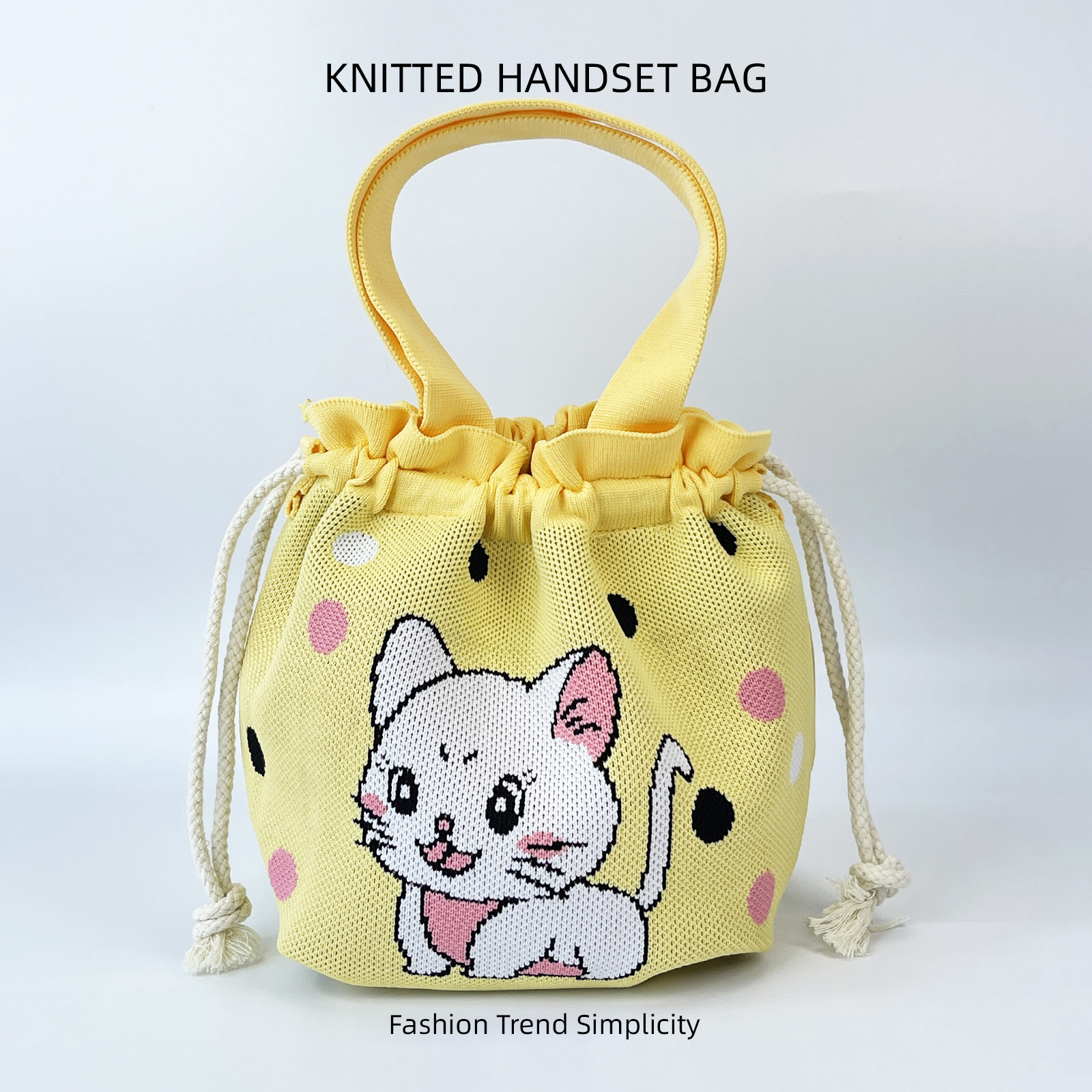针织水桶包女卡通图案可爱手拎包休闲百搭抽绳手提腋下包便当饭袋