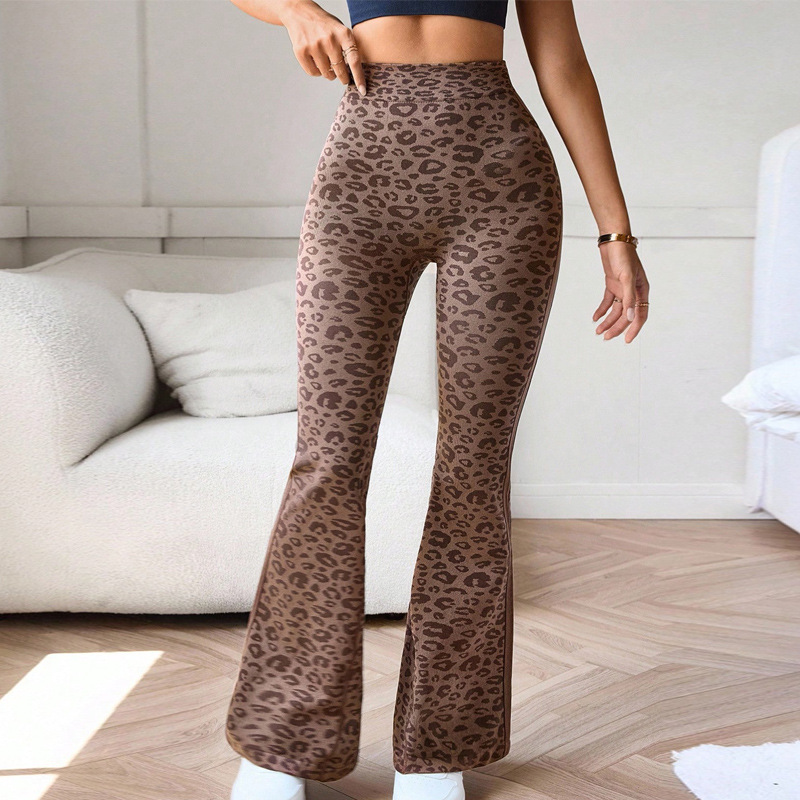 亚马逊欧美新款豹纹微喇瑜伽裤女外穿显瘦蜜桃臀健身运动喇叭裤