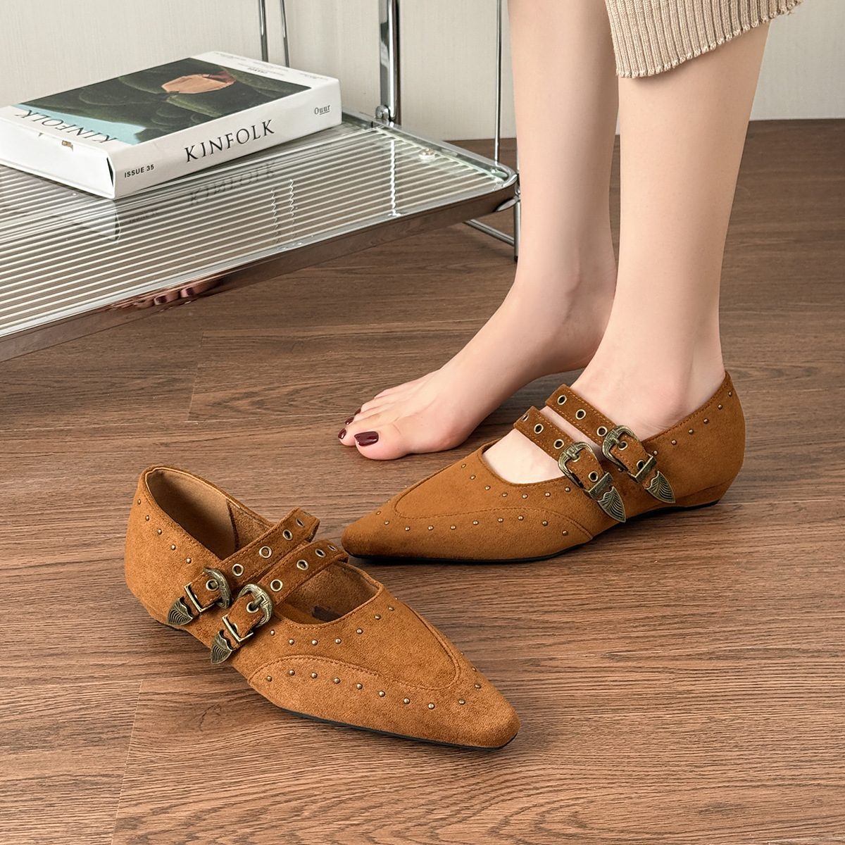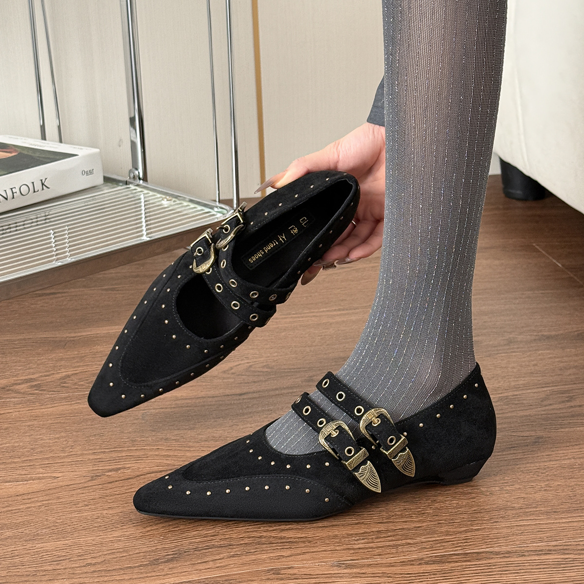 铆钉双排扣加绒玛丽珍平底鞋女软底舒适通勤百搭女鞋休闲鞋秋冬