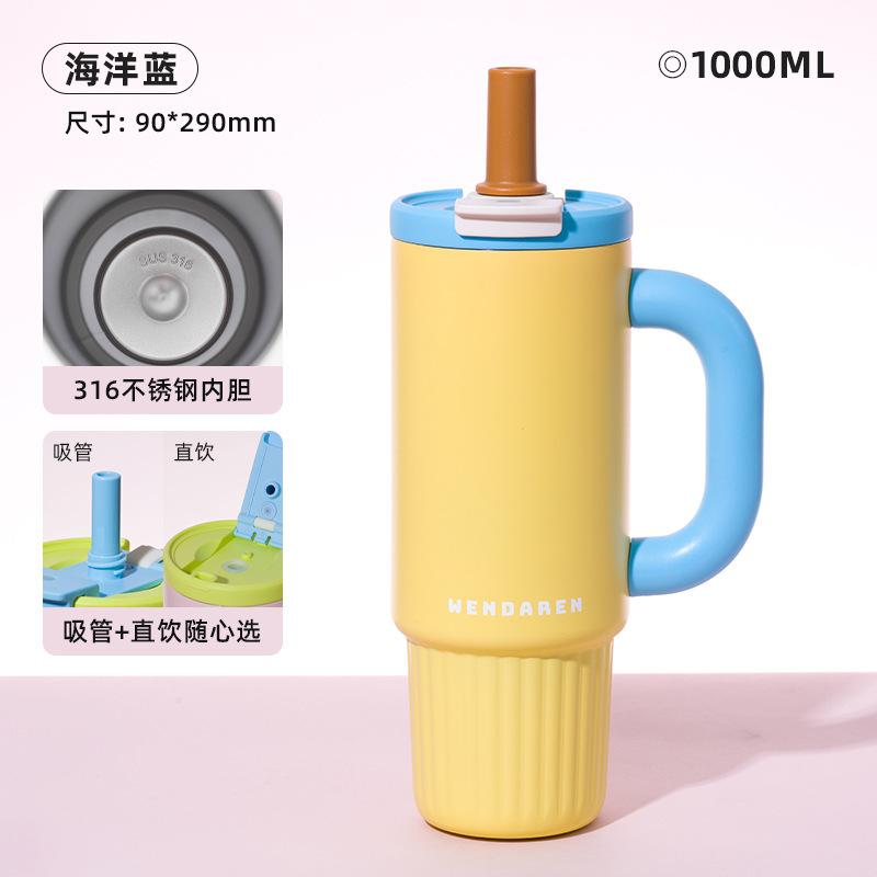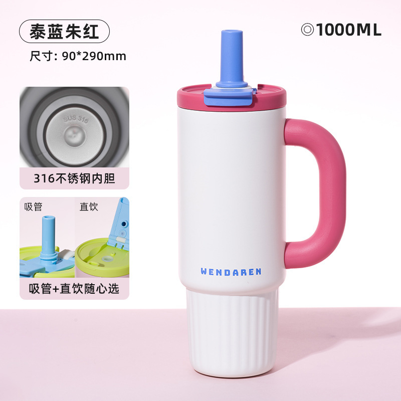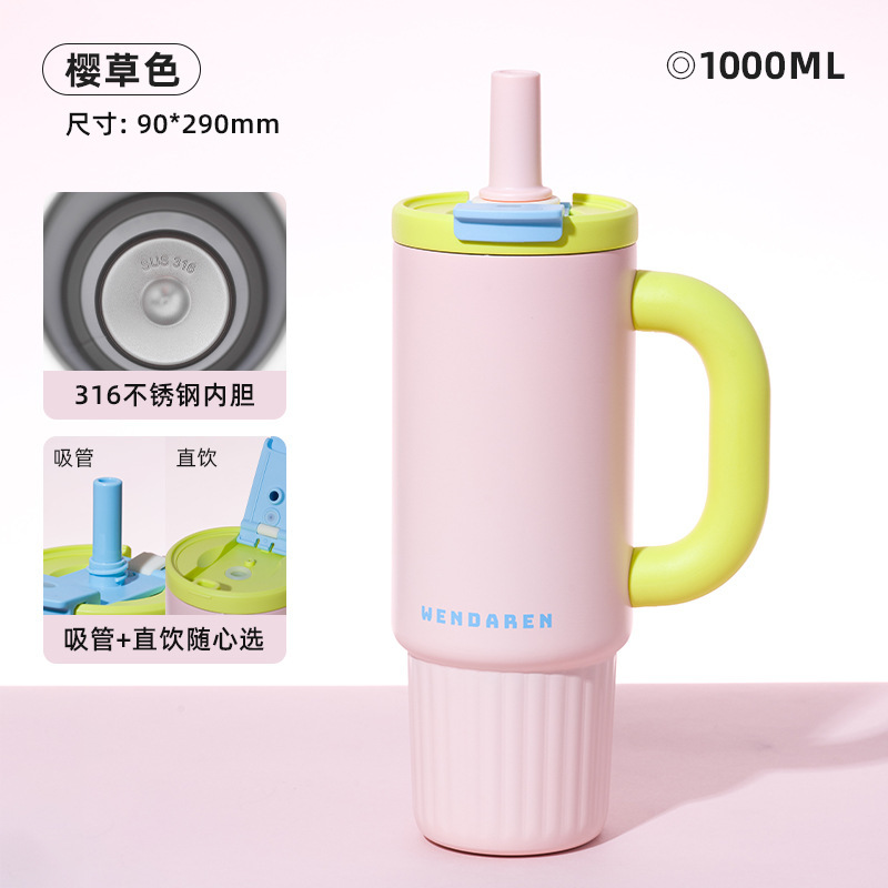 不锈钢吸管保温杯女高颜值大容量陶瓷内胆水杯车载保冷把手冰霸杯