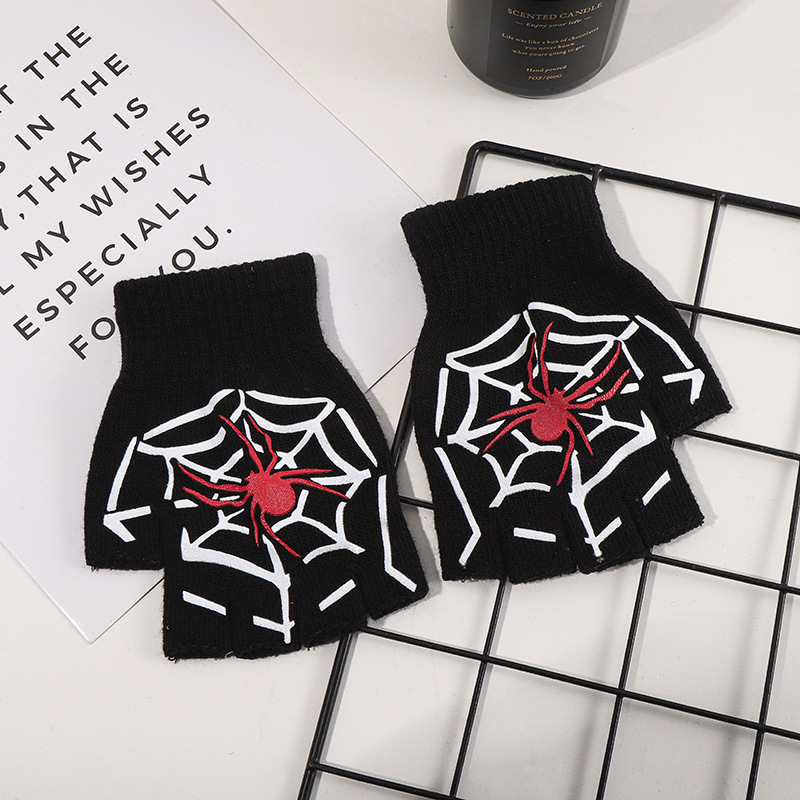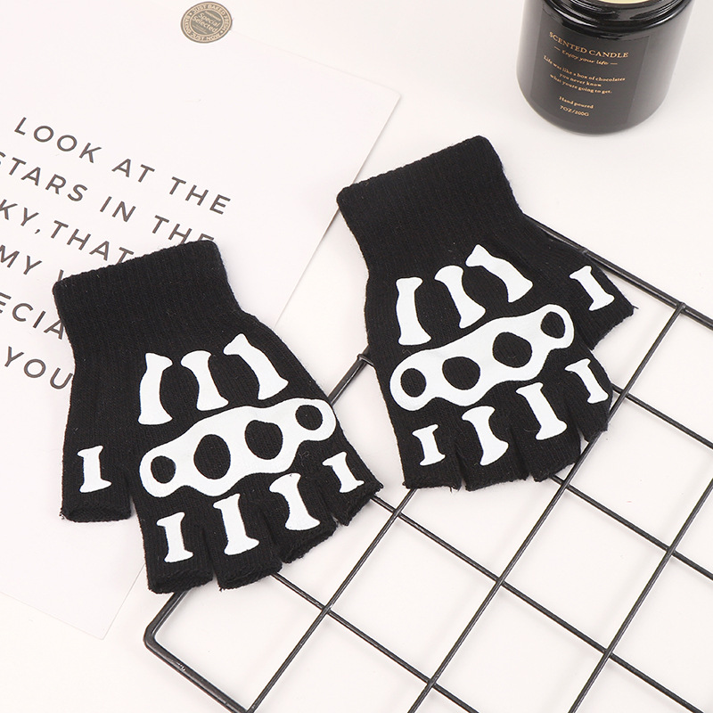 冬季保暖针织半指手套万圣节夜光荧光骷髅头手爪印刷骑行防滑手套