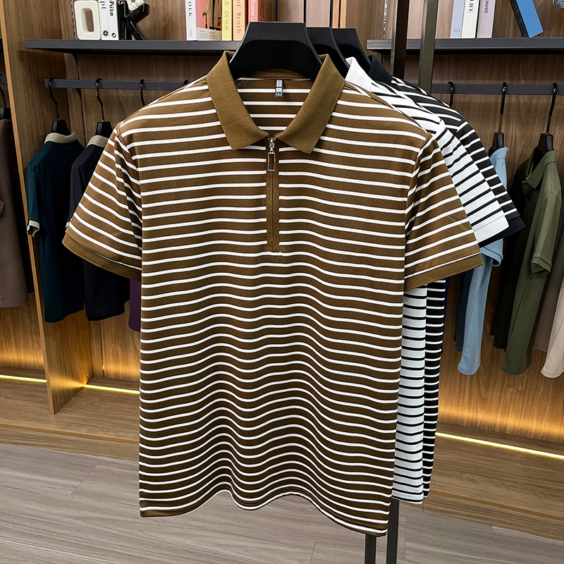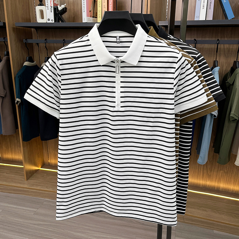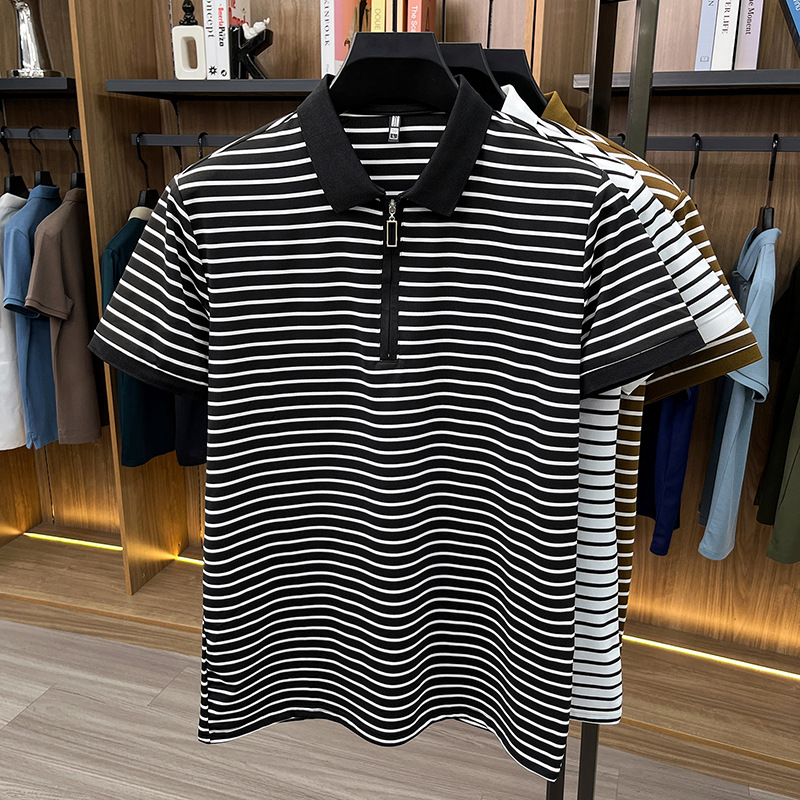 夏季新款条纹男士体恤半拉链短袖Polo衫翻领薄款棉T跨境外贸男装