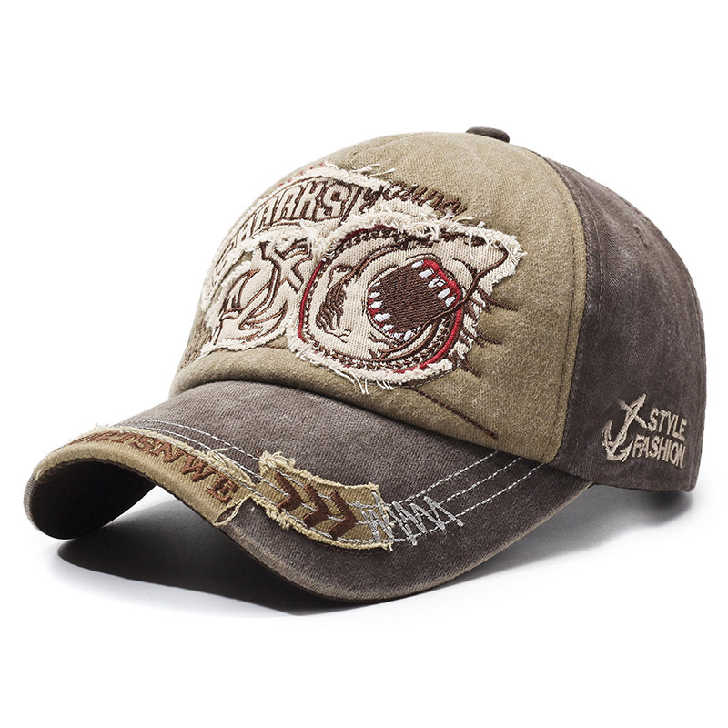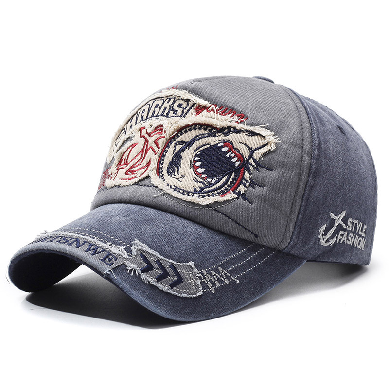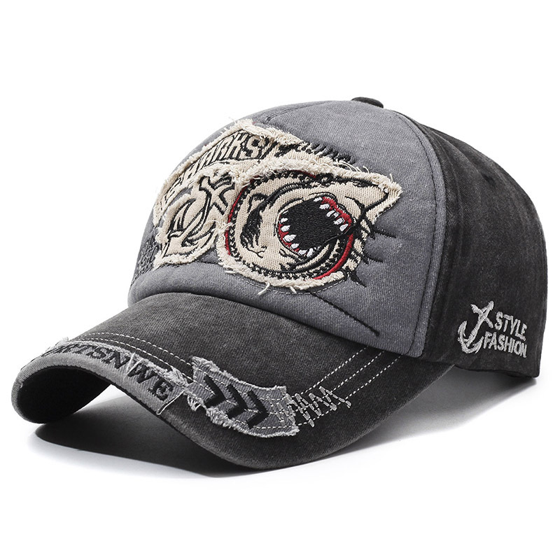 跨境帽子鲨鱼破洞做旧嘻哈风春秋男女款防晒遮阳百搭刺绣棒球帽