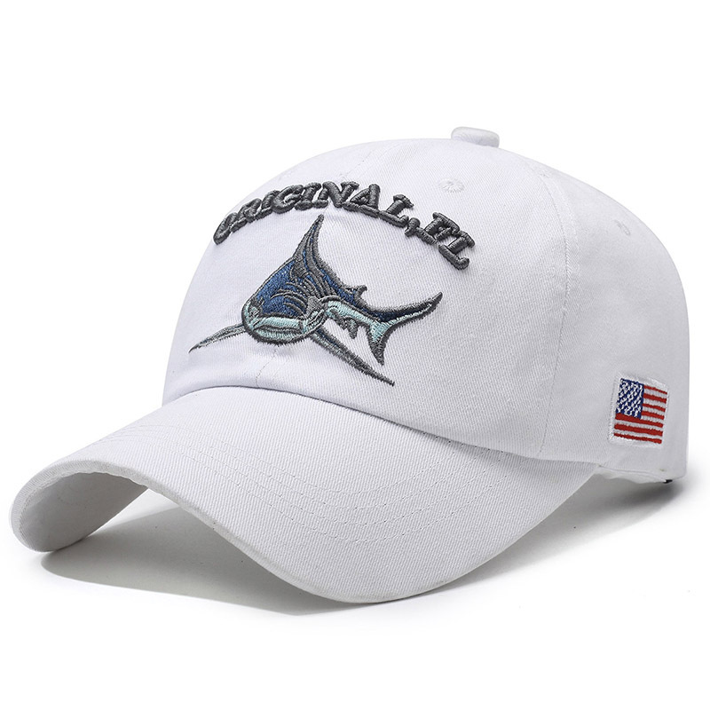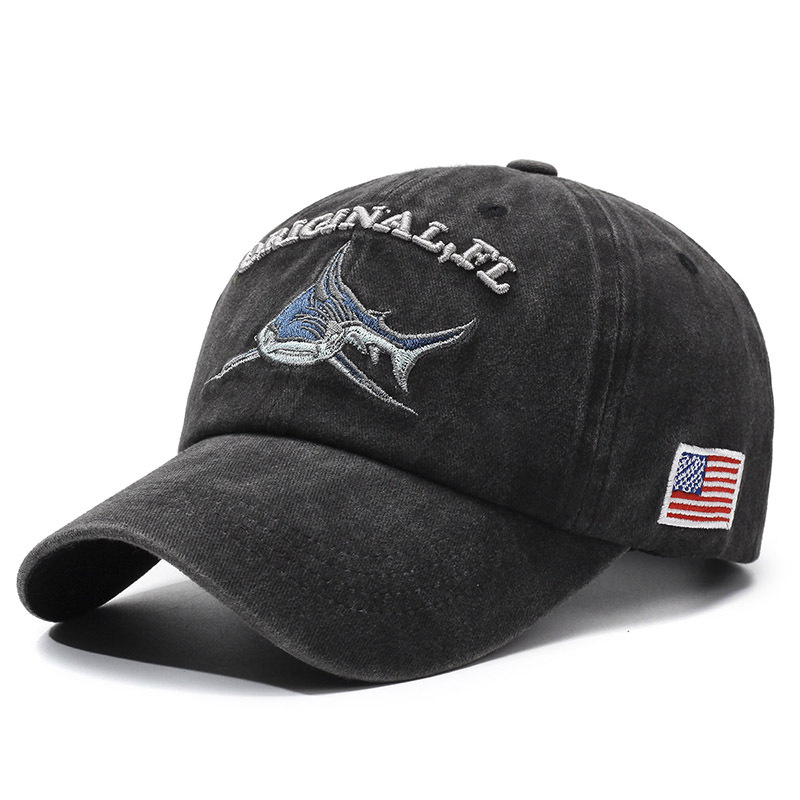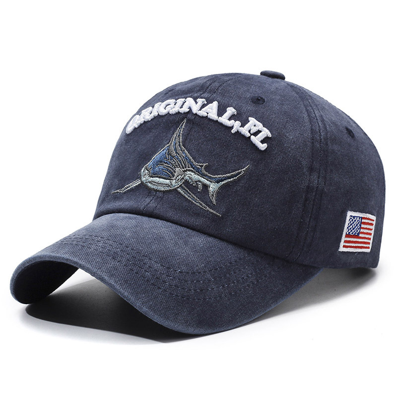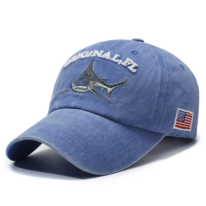 跨境水洗做旧帽子男款休闲透气防晒遮阳鸭舌帽鲨鱼图案绣花棒球帽