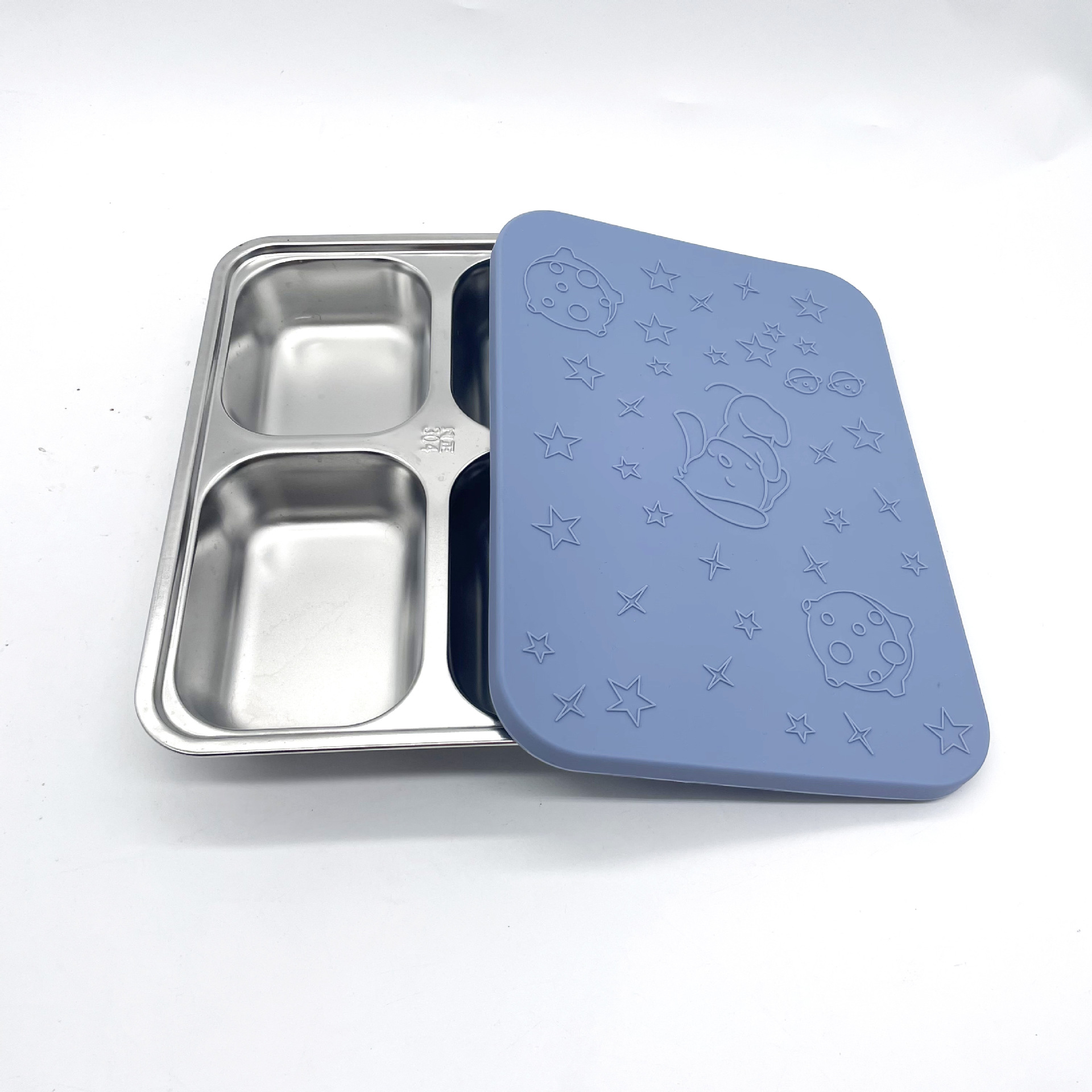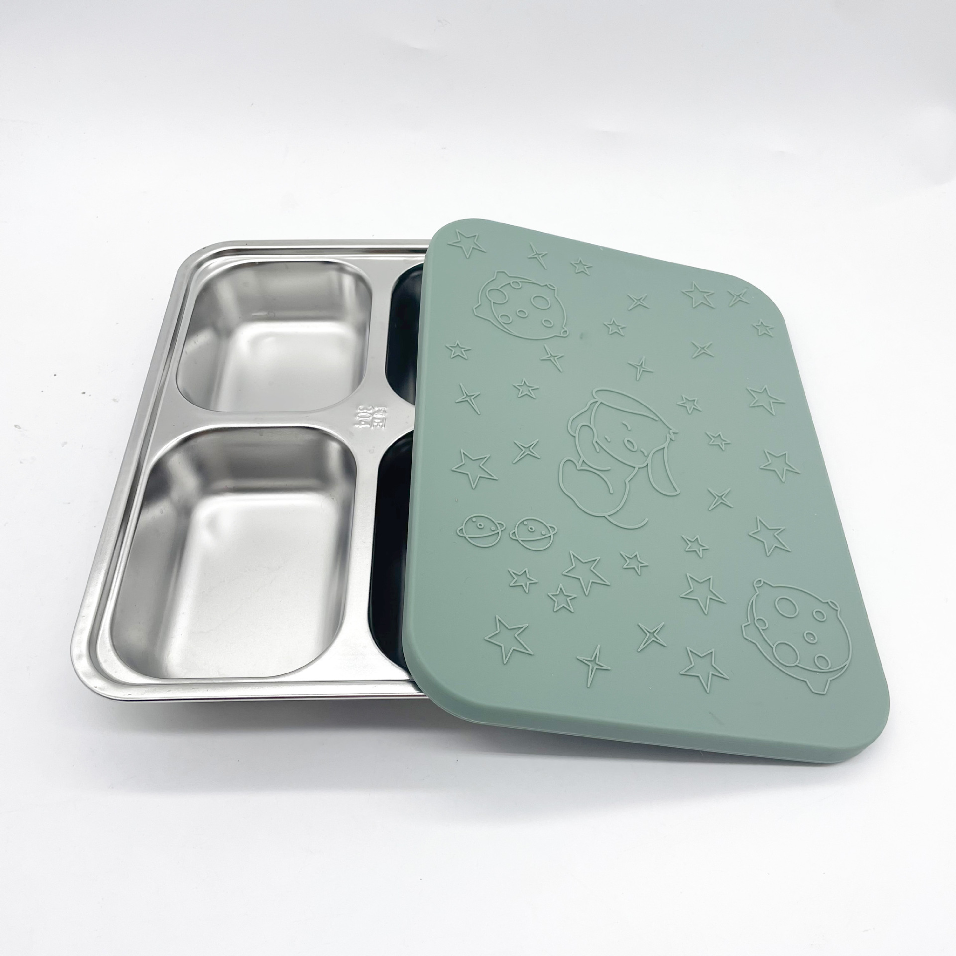 不锈钢分隔餐盘带硅胶盖方形饭盒快餐盘学生四格便当盒儿童午餐盒
