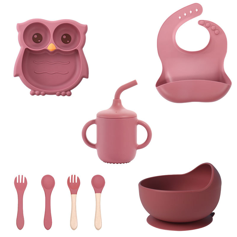 酒红色 猫头鹰硅胶辅食盘8件套