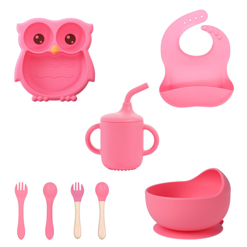 粉红色 猫头鹰硅胶辅食盘8件套