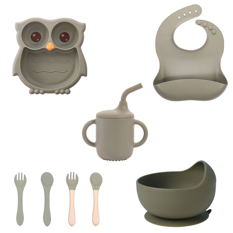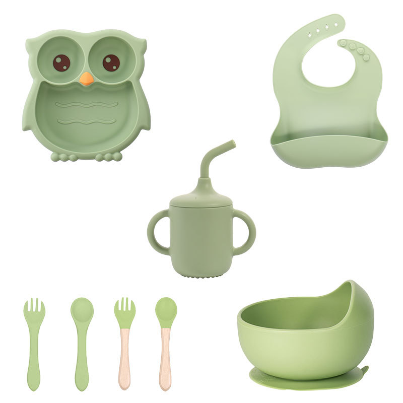 军绿色 猫头鹰硅胶辅食盘8件套