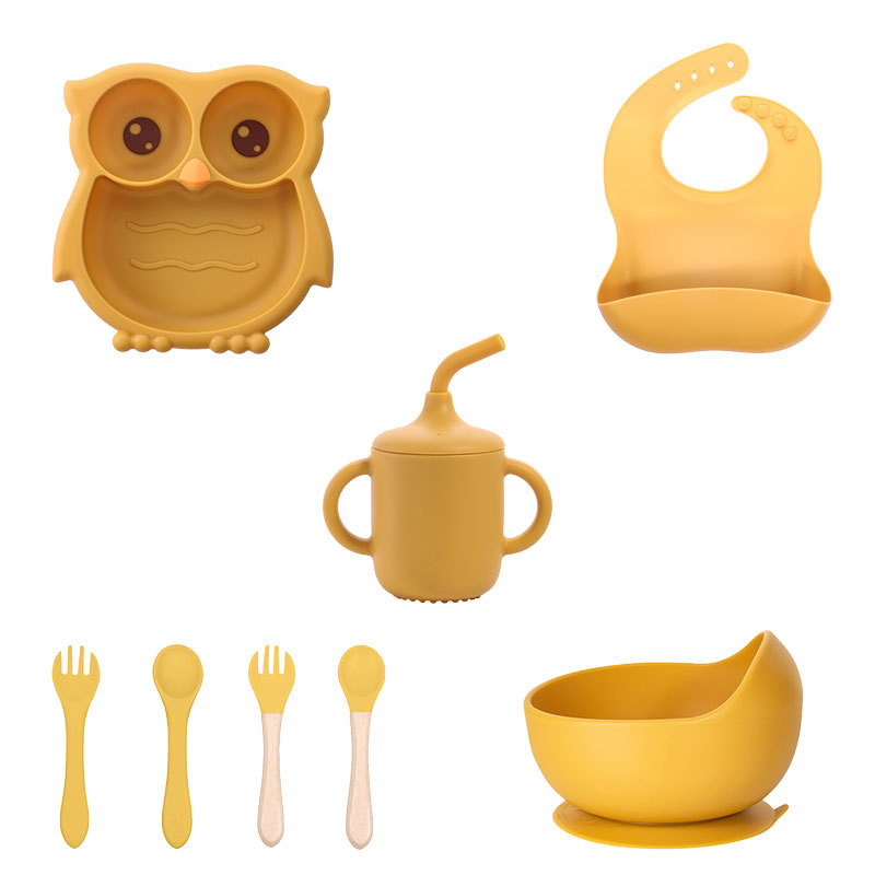 土黄色 猫头鹰硅胶辅食盘8件套