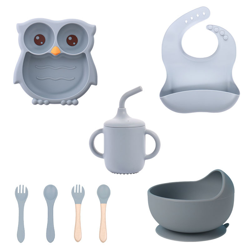 青色 猫头鹰硅胶辅食盘8件套