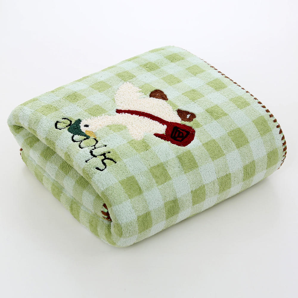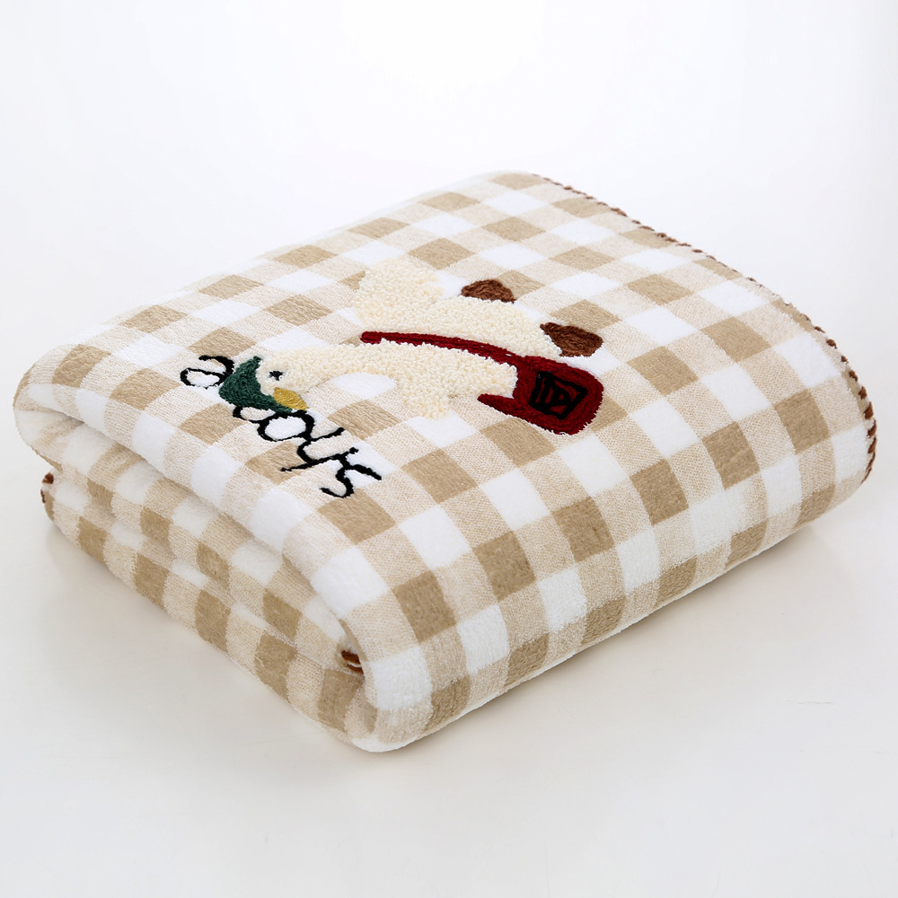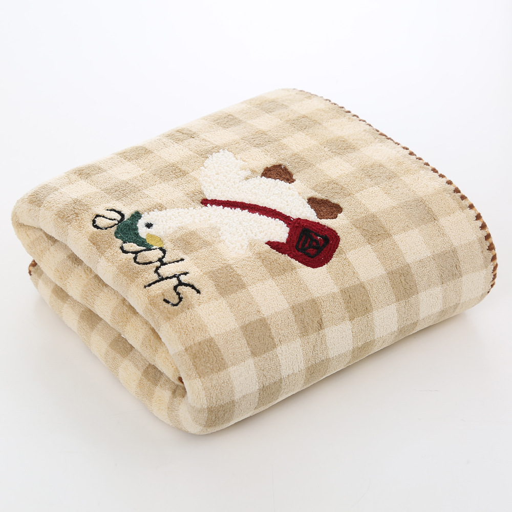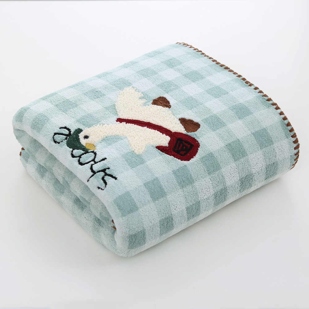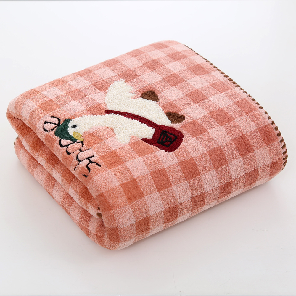 促销开学季珊瑚绒跨境新品格子款刺绣可爱鸭毛巾浴巾吸水不掉毛