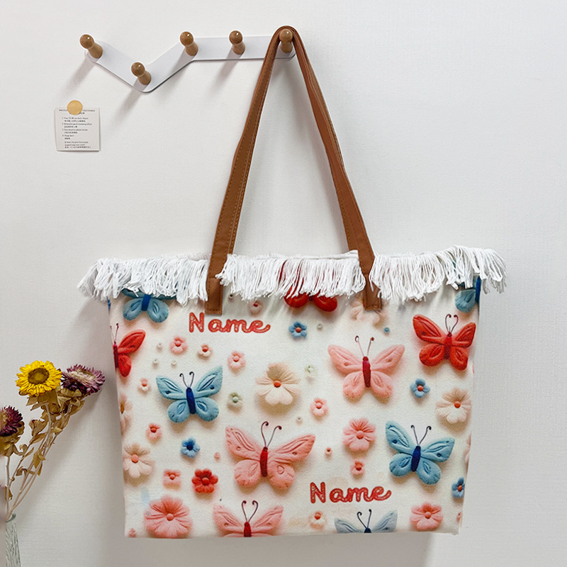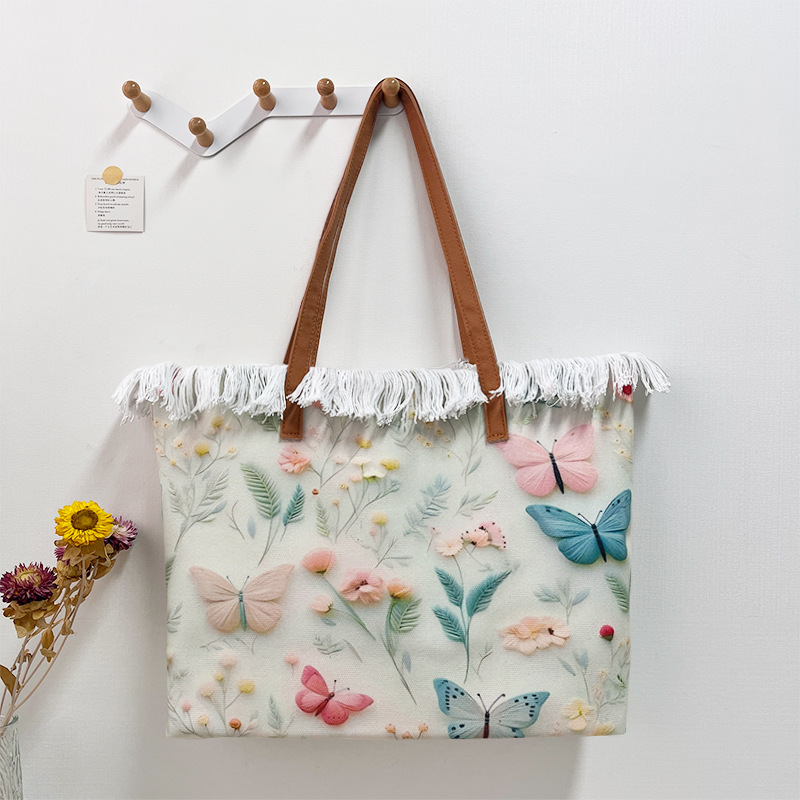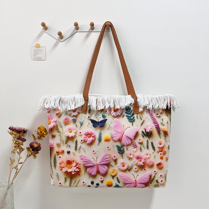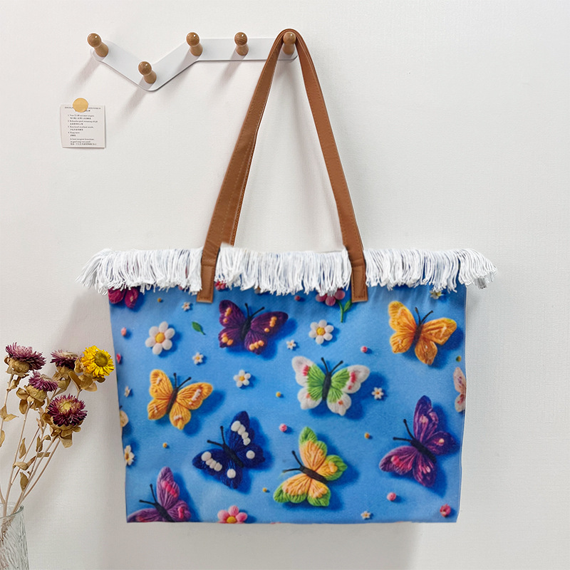 跨境现货新款流苏包3D印刷拉链大容量流苏包沙滩包女士双面可洗涤