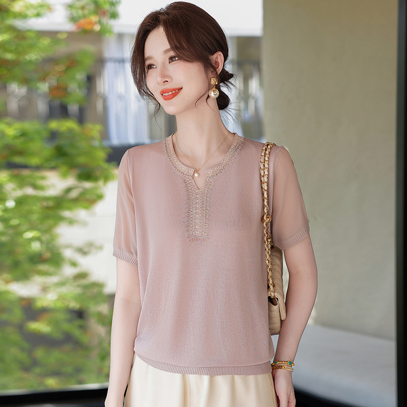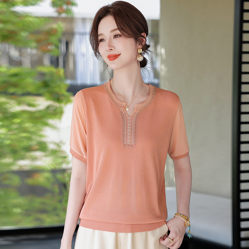 新款妈妈洋气短袖T恤中年女装夏装薄款上衣服中老年时尚冰丝小衫