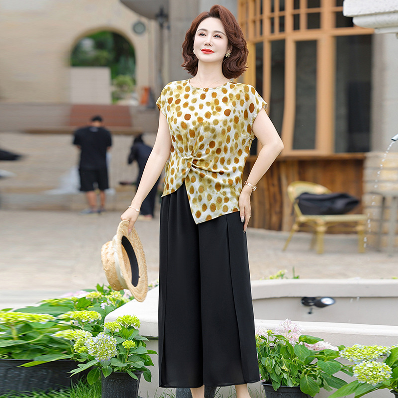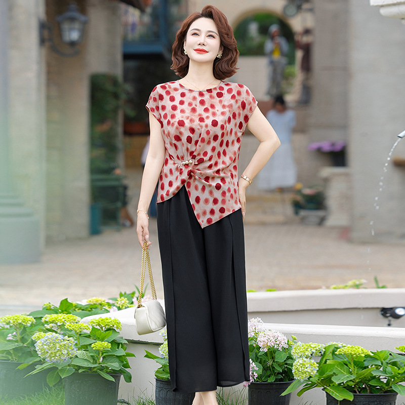 妈妈装夏季新款套装时尚休闲中年两件套捏褶收腰显瘦大码上衣套装