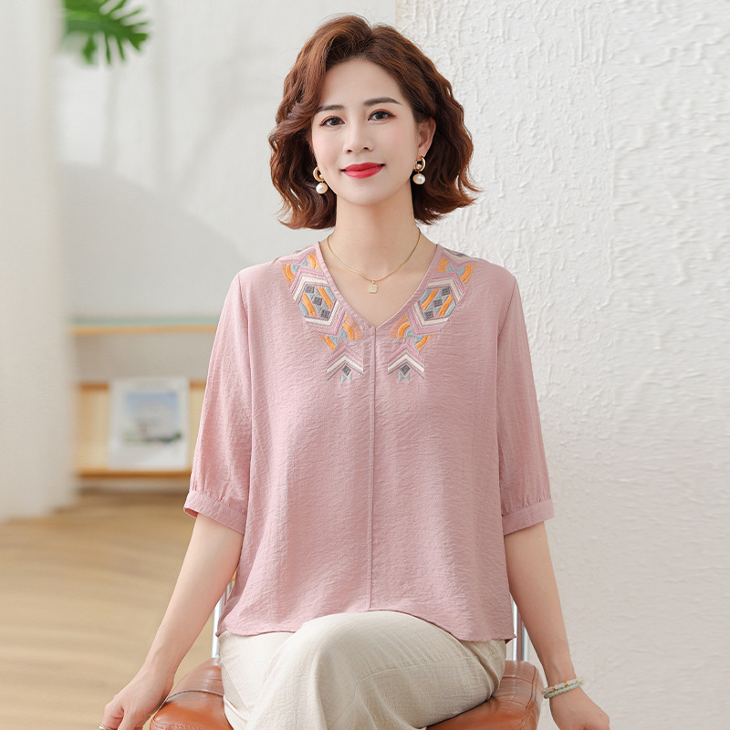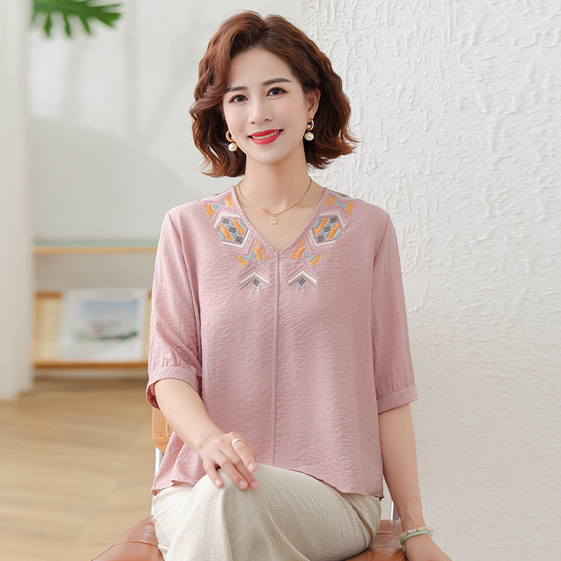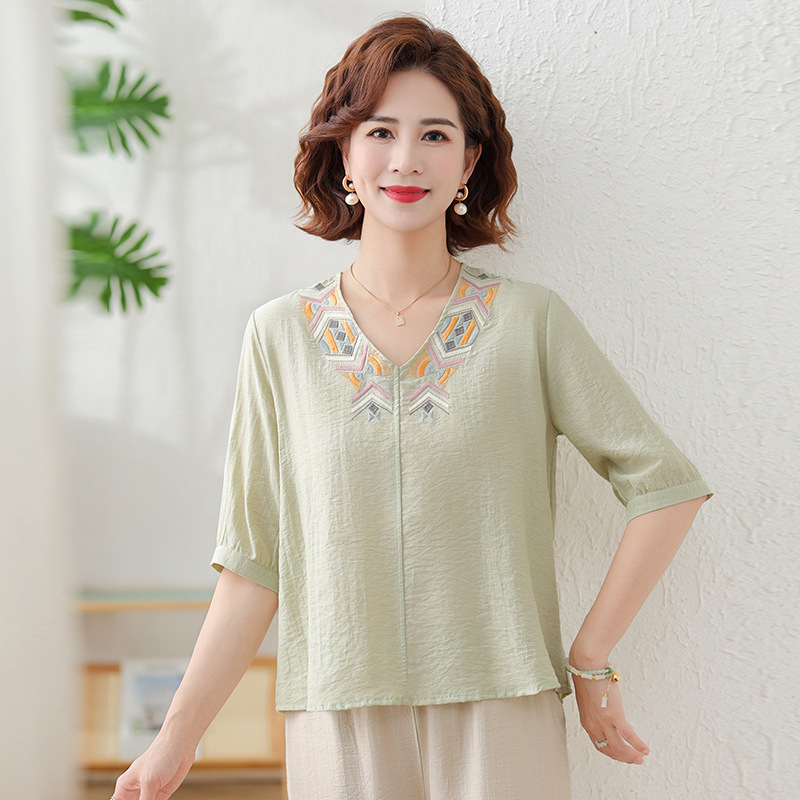 小个子妈妈夏装棉麻衬衫中袖小衫中老年女刺绣圆领宽松大码套装新