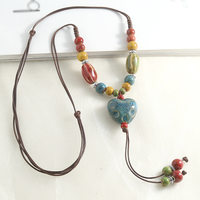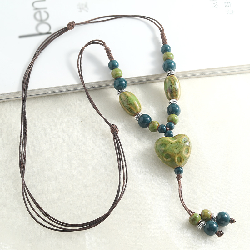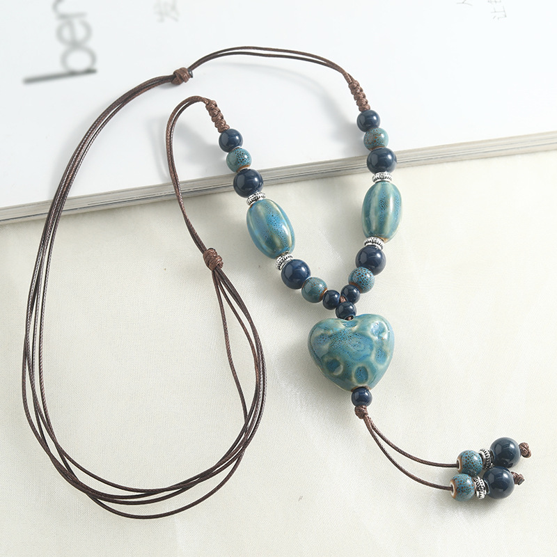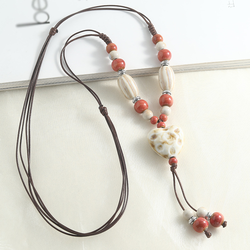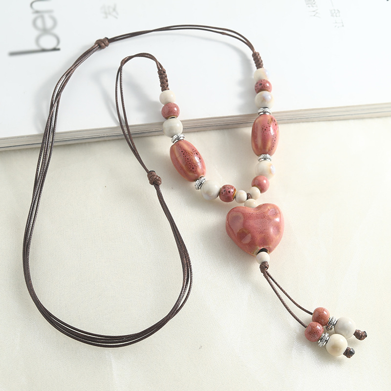 复古民族风陶瓷项链饰品小众设计爱心吊坠长款毛衣链简约百搭批发
