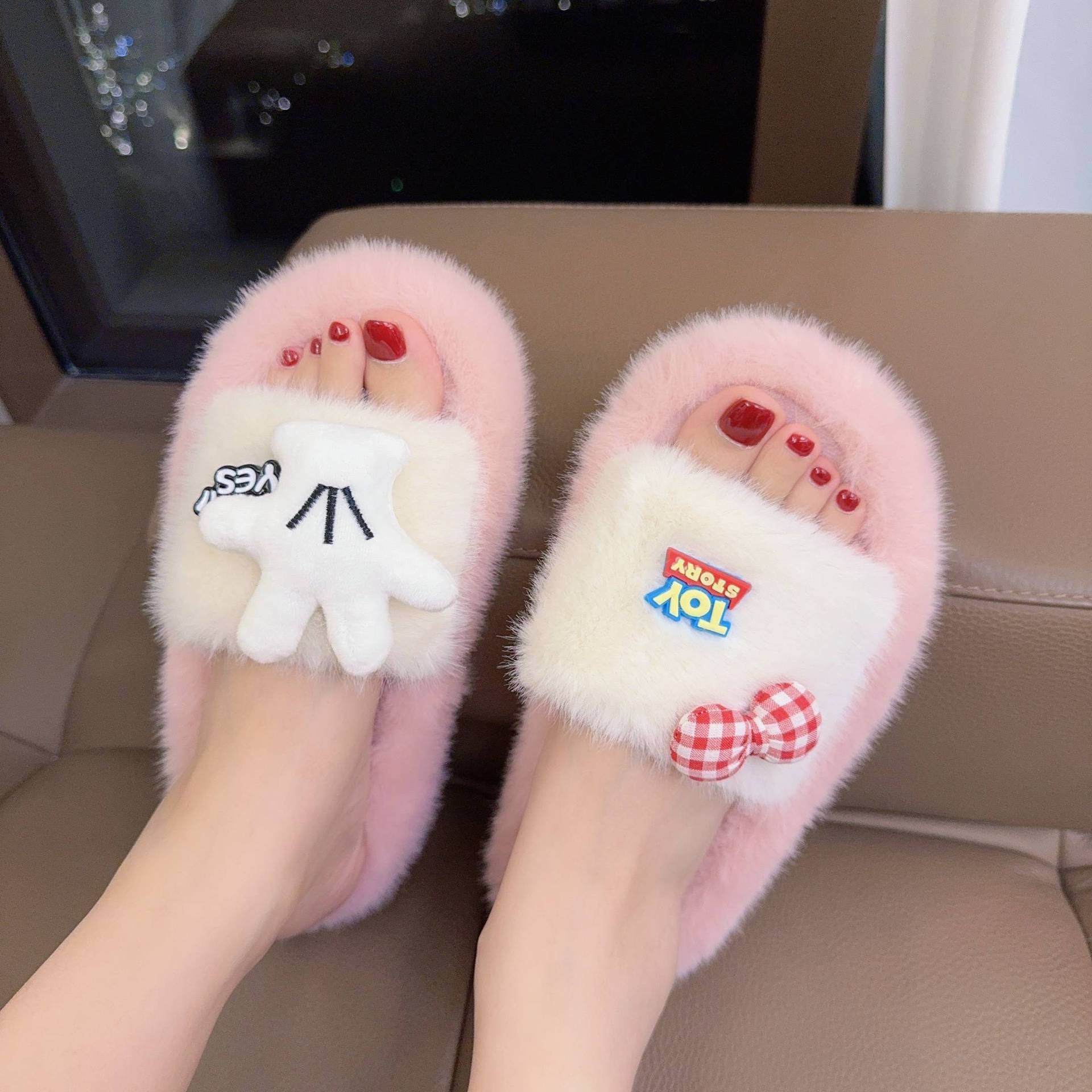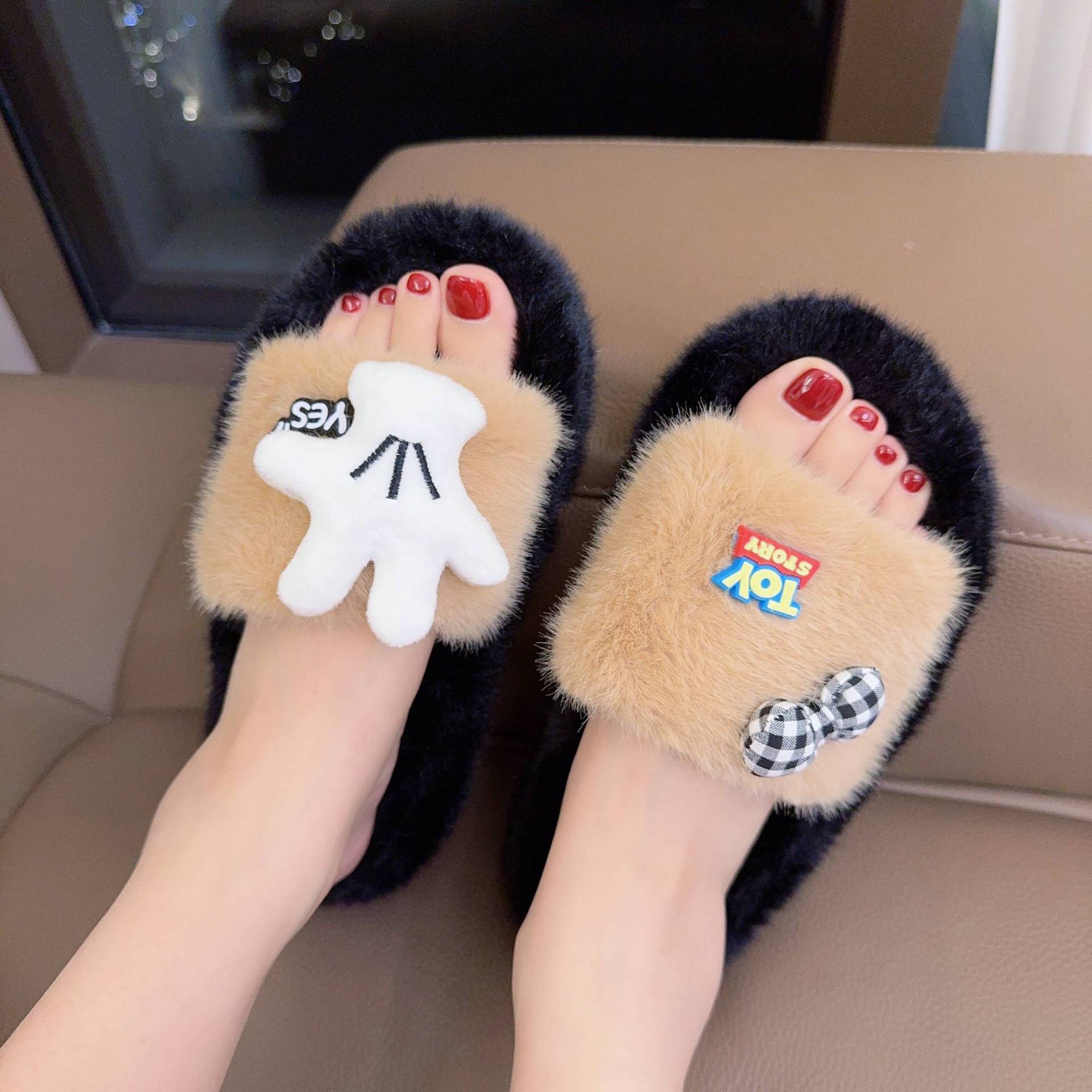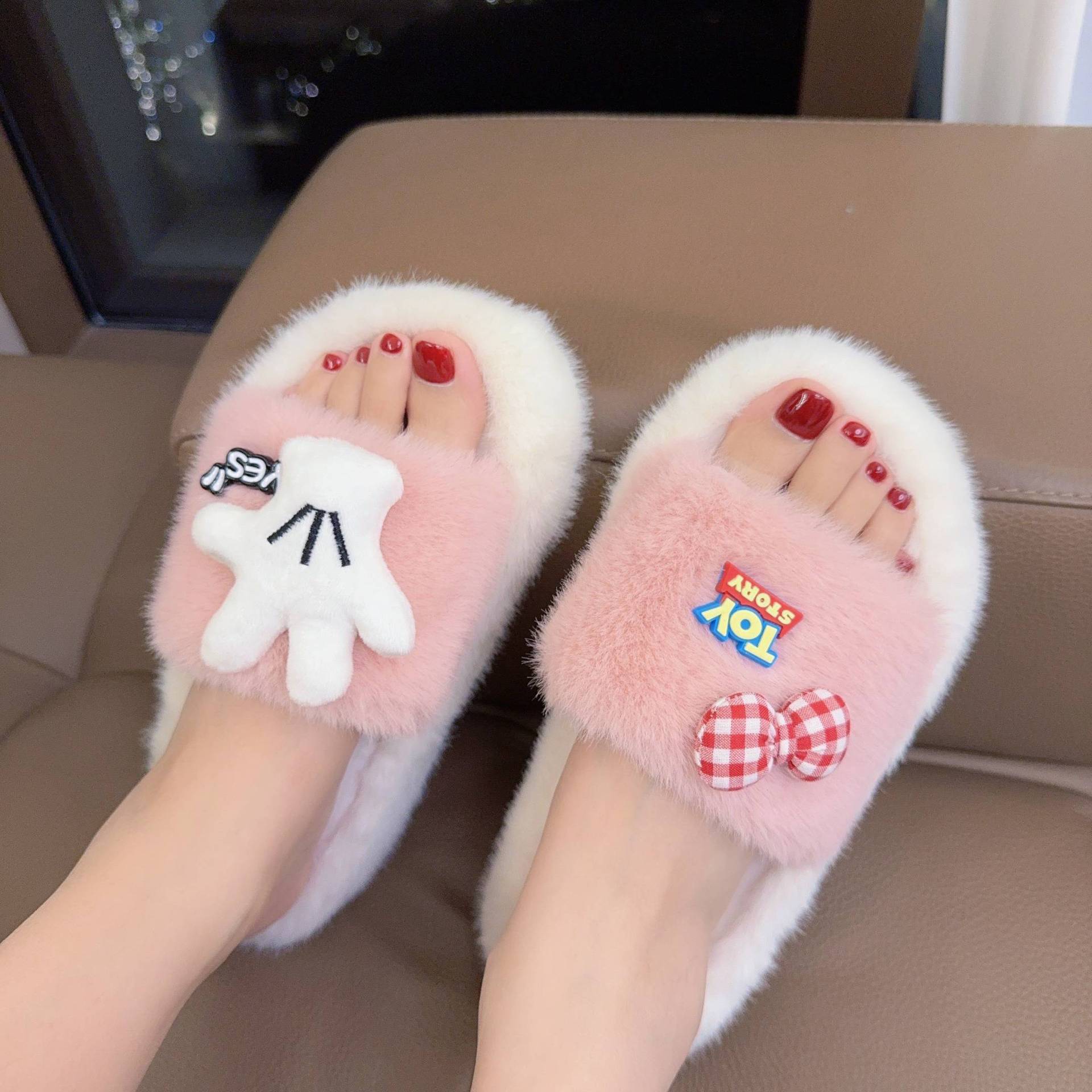 新款少女学生秋冬季一字拖百搭小狗厚底防滑居家外穿软底毛绒拖鞋