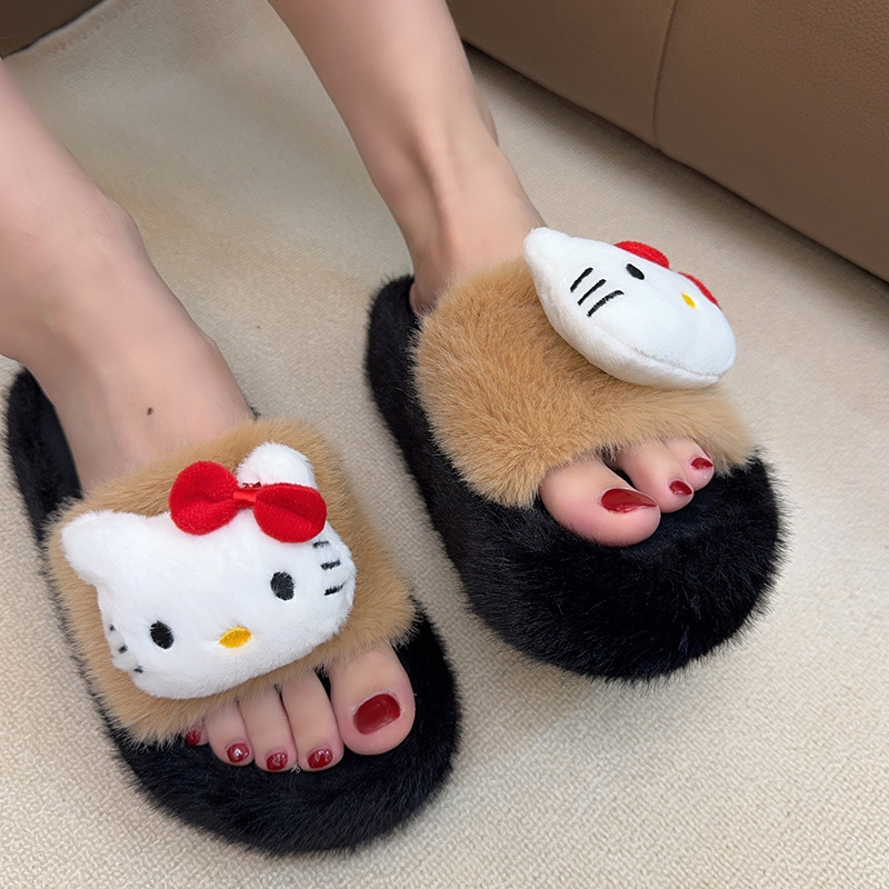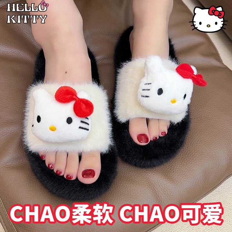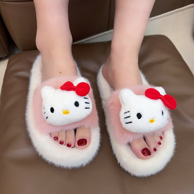 秋冬季少女可爱KT猫毛绒休闲卡通动漫防滑一字拖软底外穿卡通ins