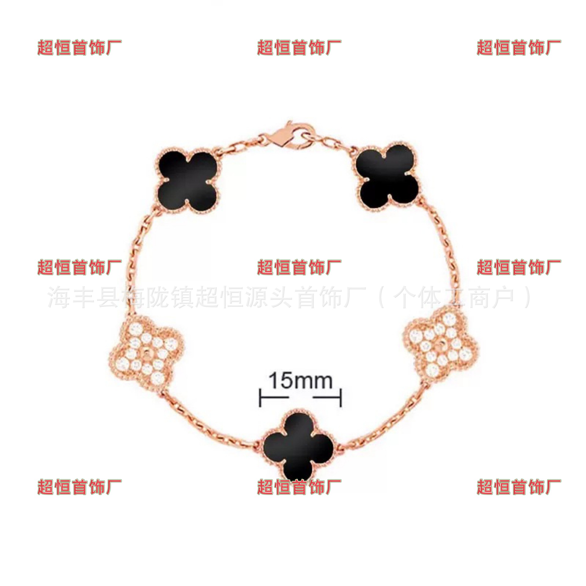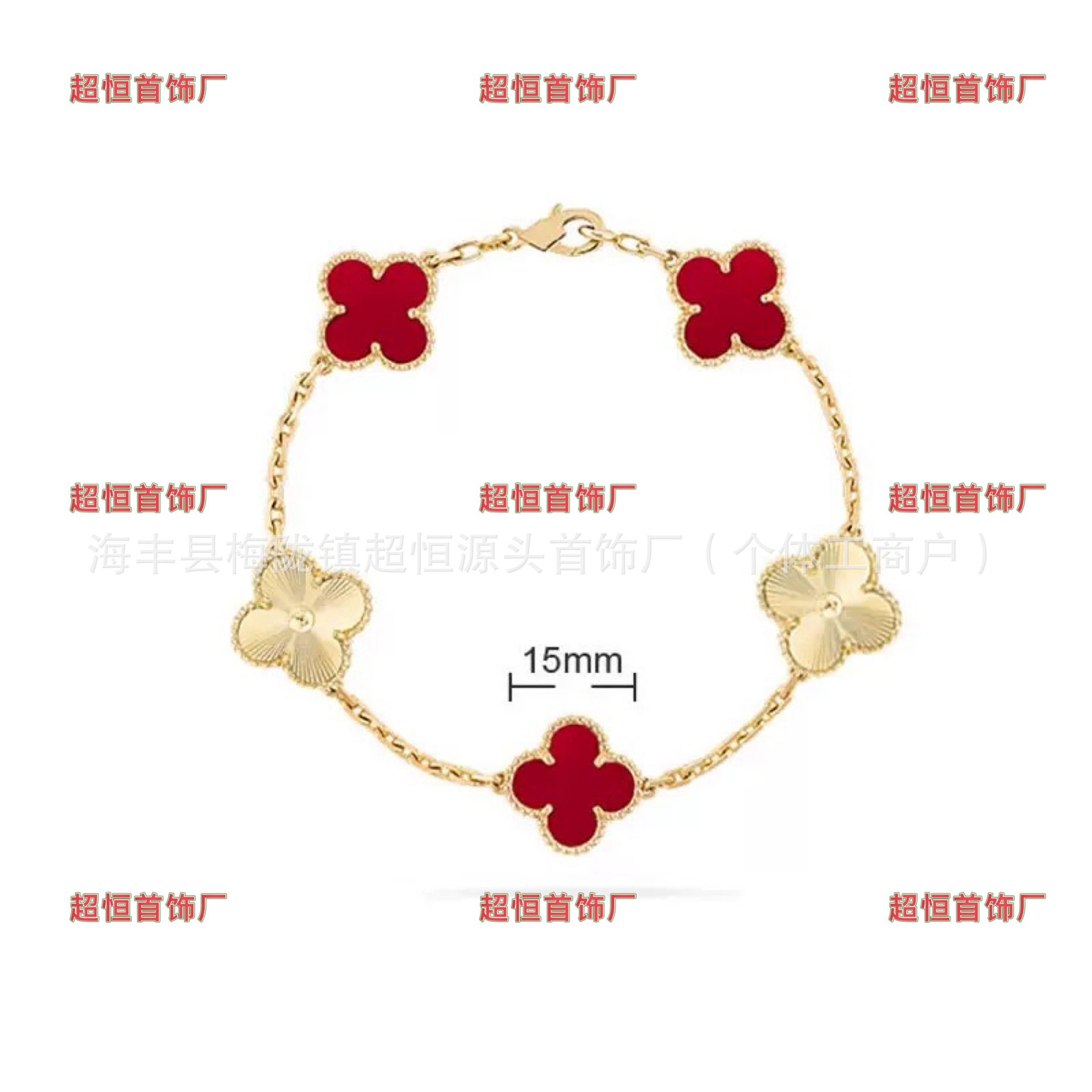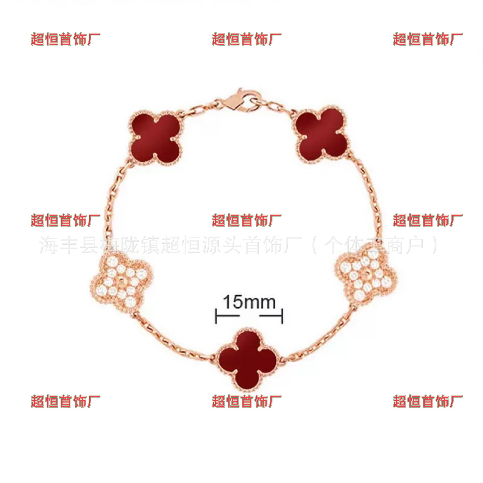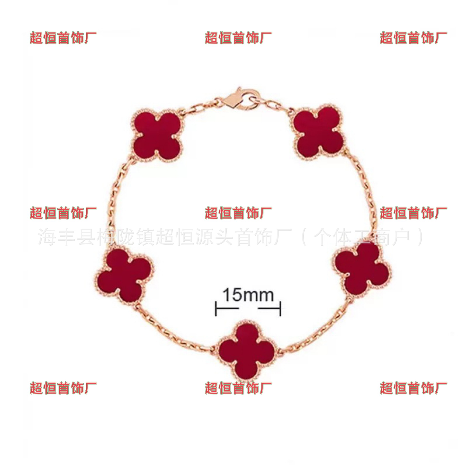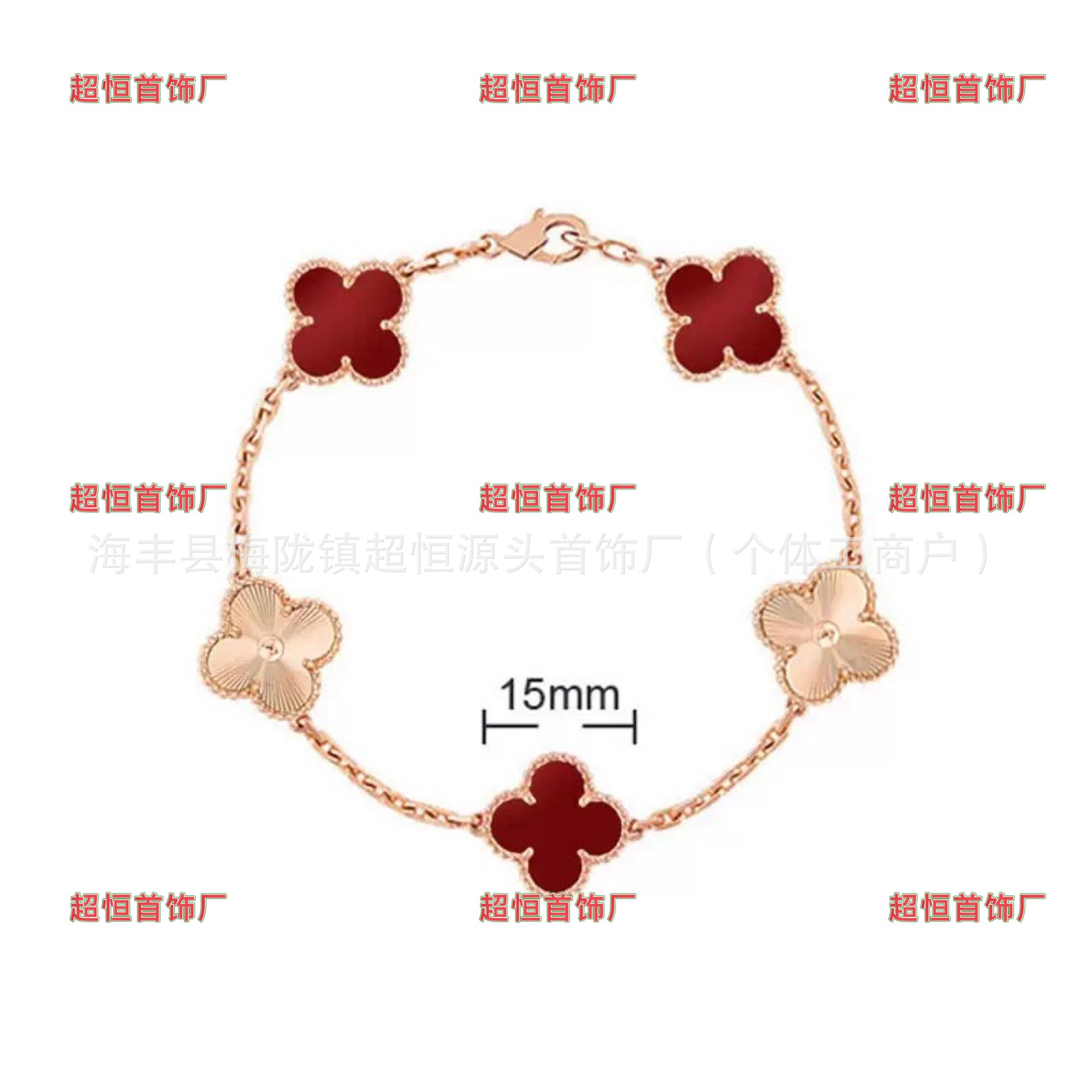 V金CNC精雕瘦花18k玫瑰金红玛瑙熊猫四叶草925银五花手链直播批发