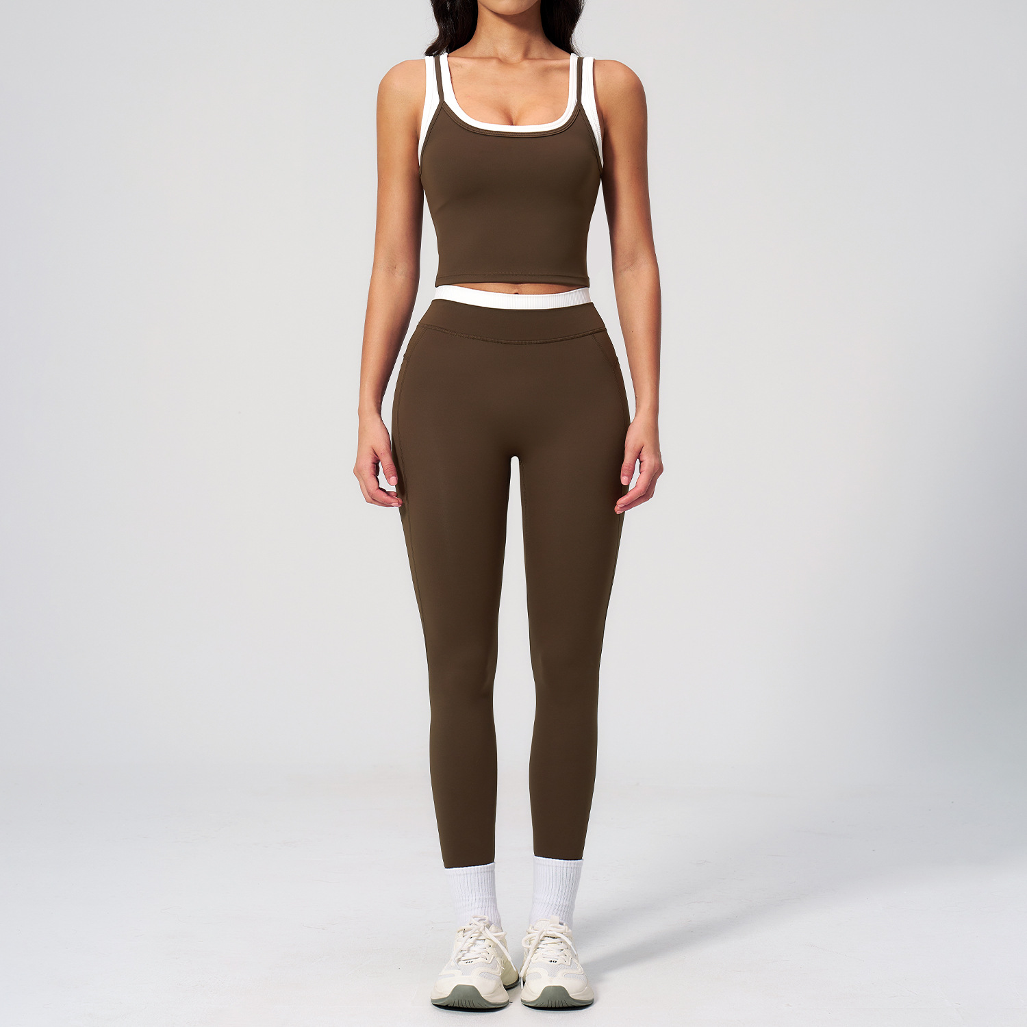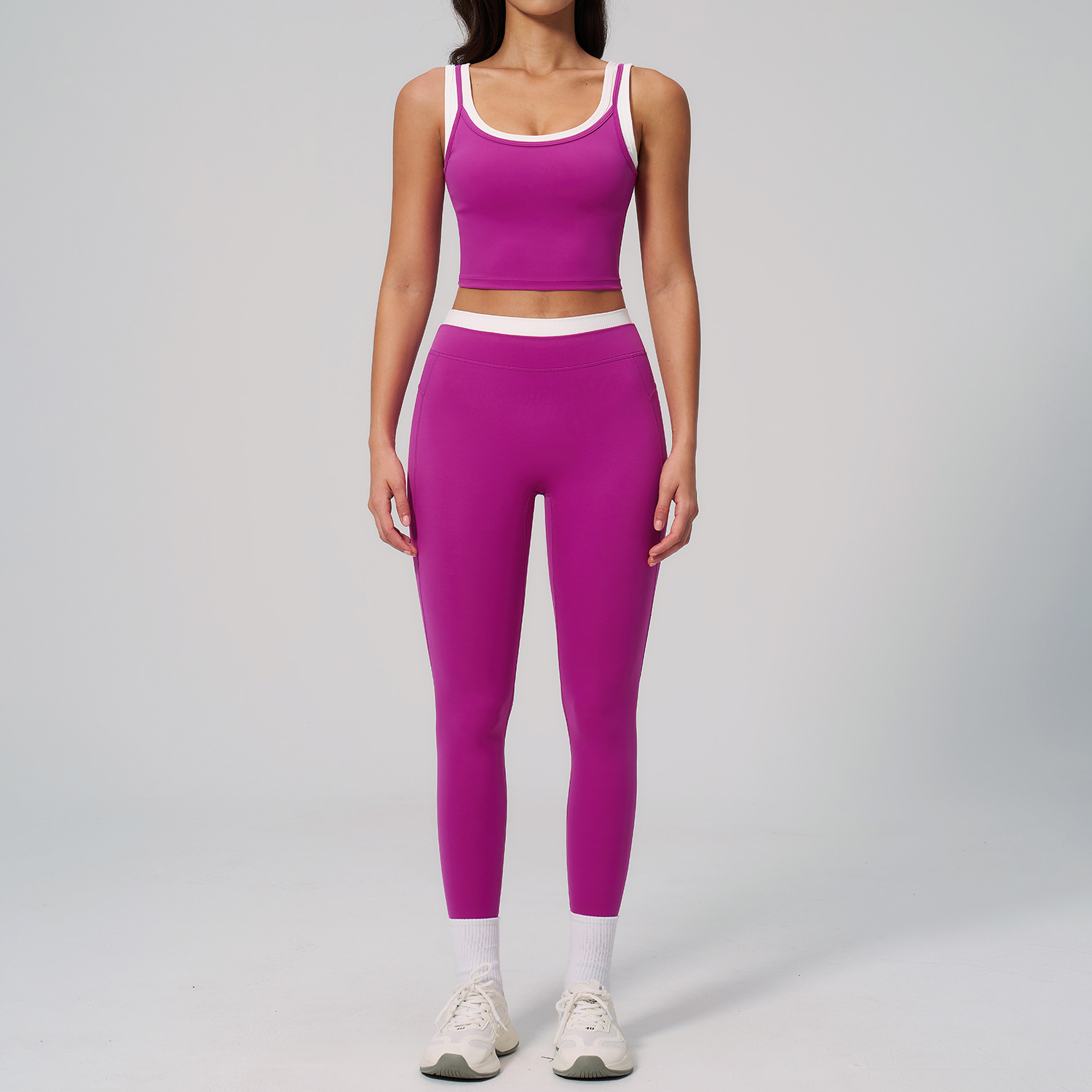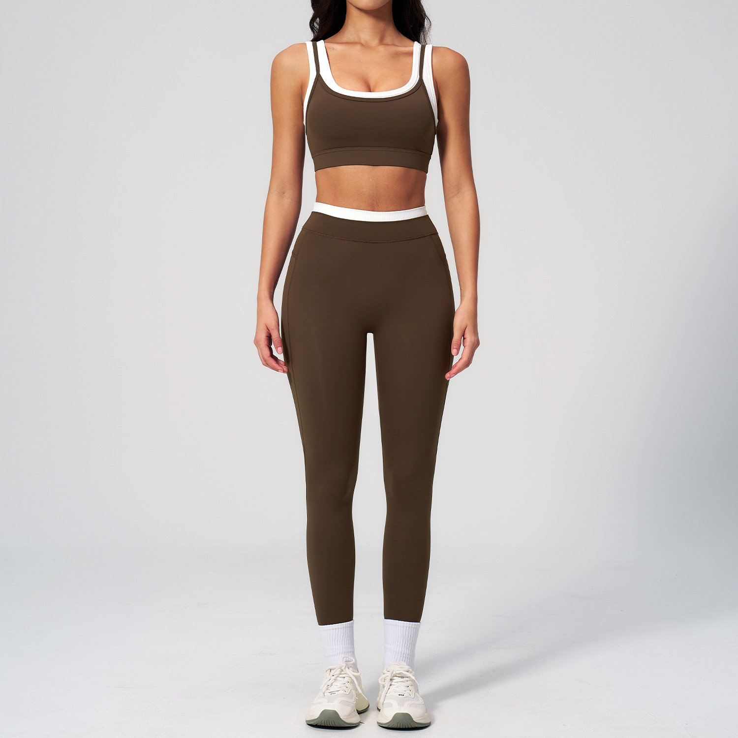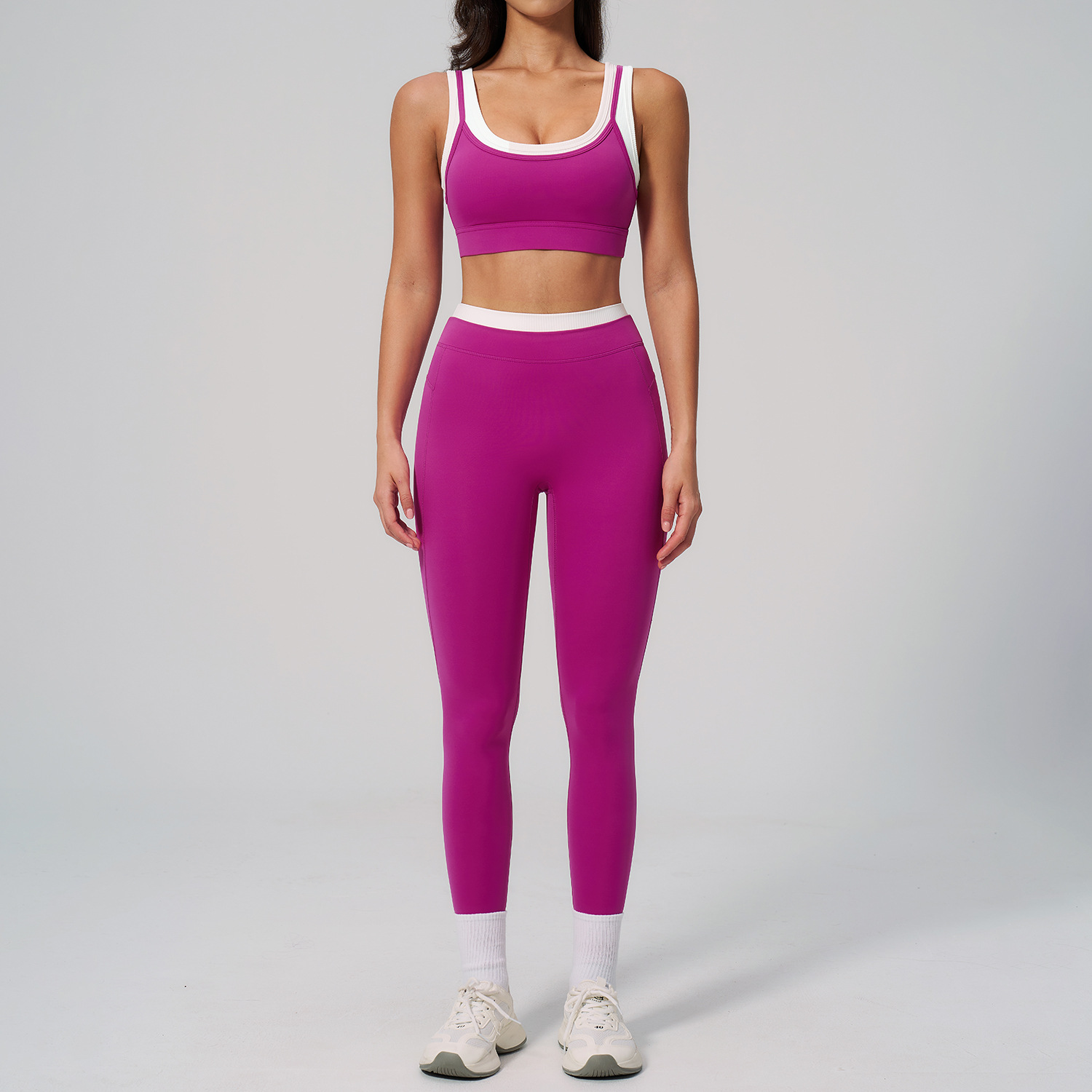 跨境撞色裸感瑜伽套装螺纹高腰户外休闲百搭健身运动套装