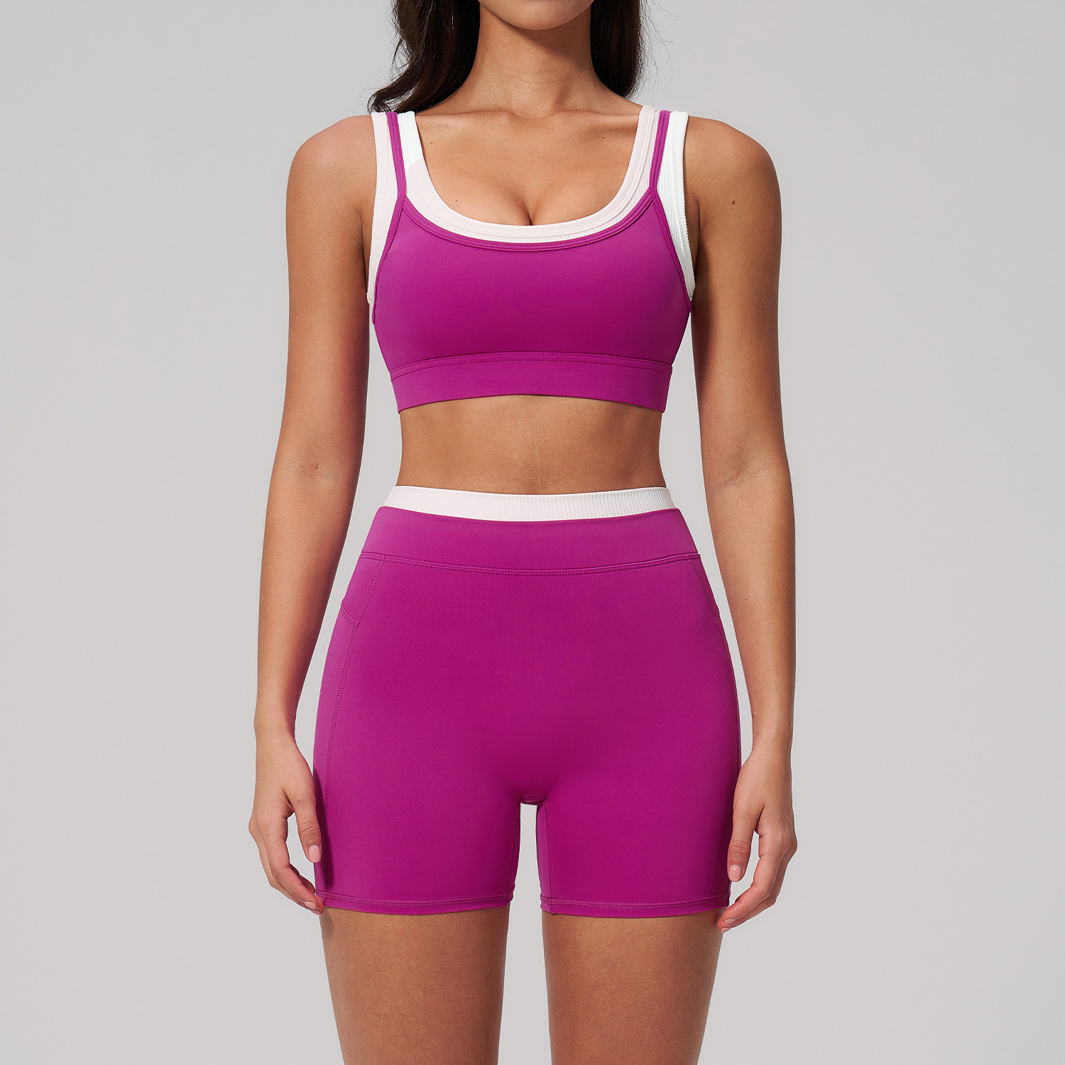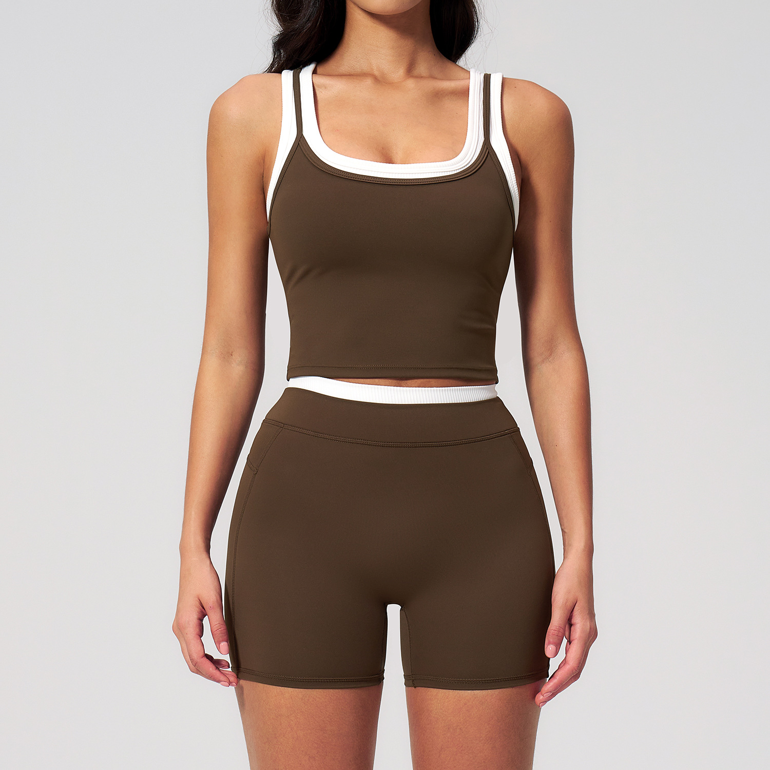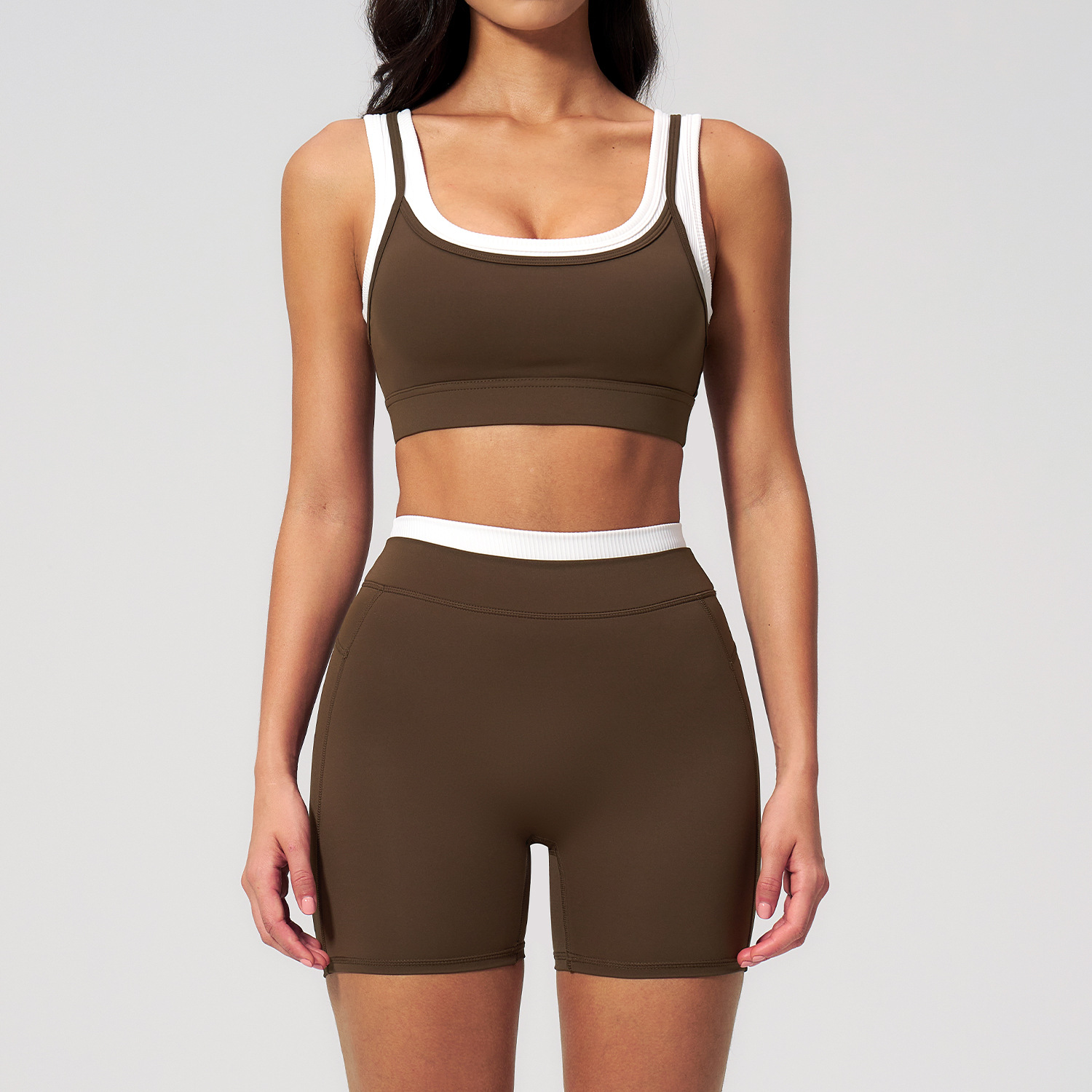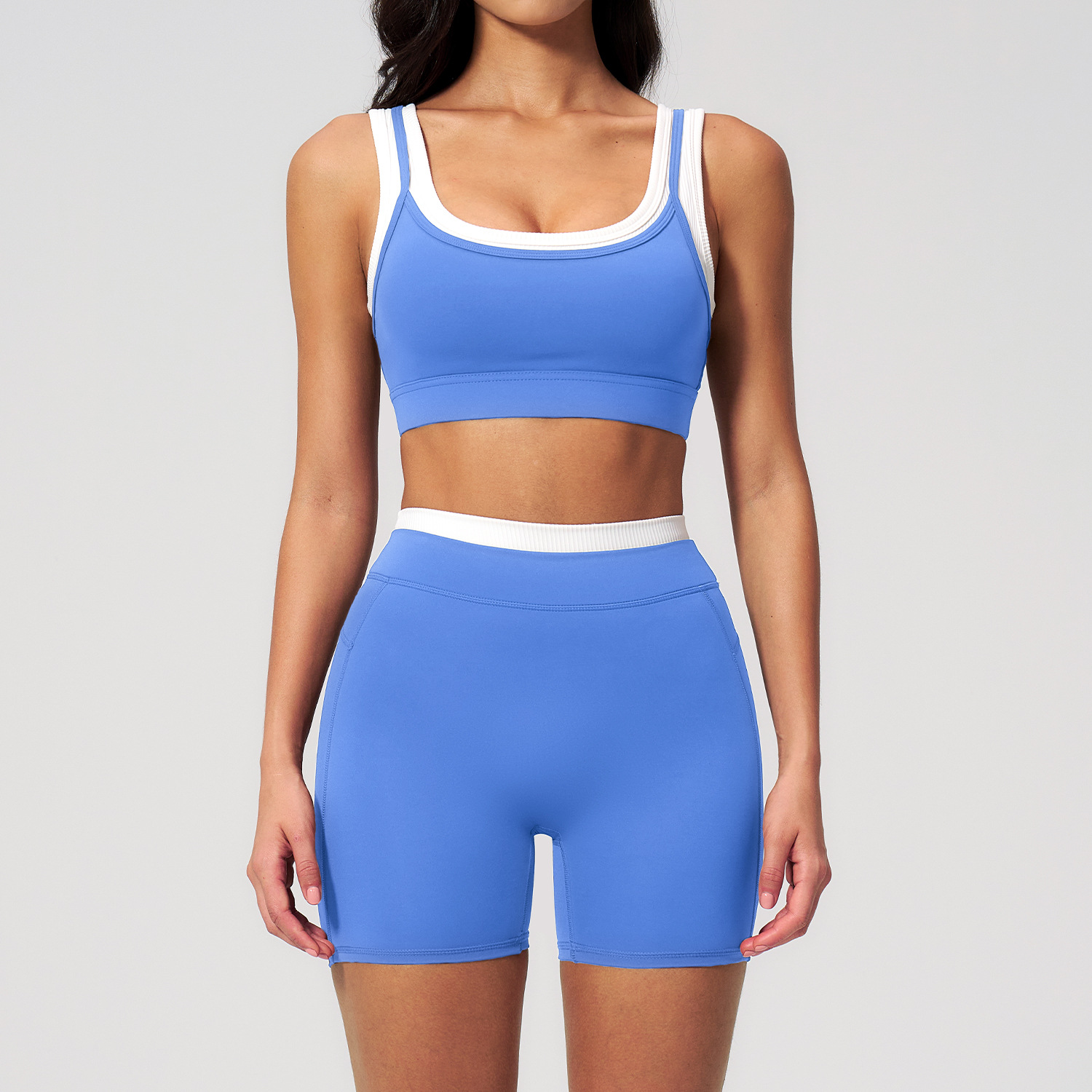 跨境撞色裸感瑜伽套装螺纹高腰户外休闲百搭健身运动套装