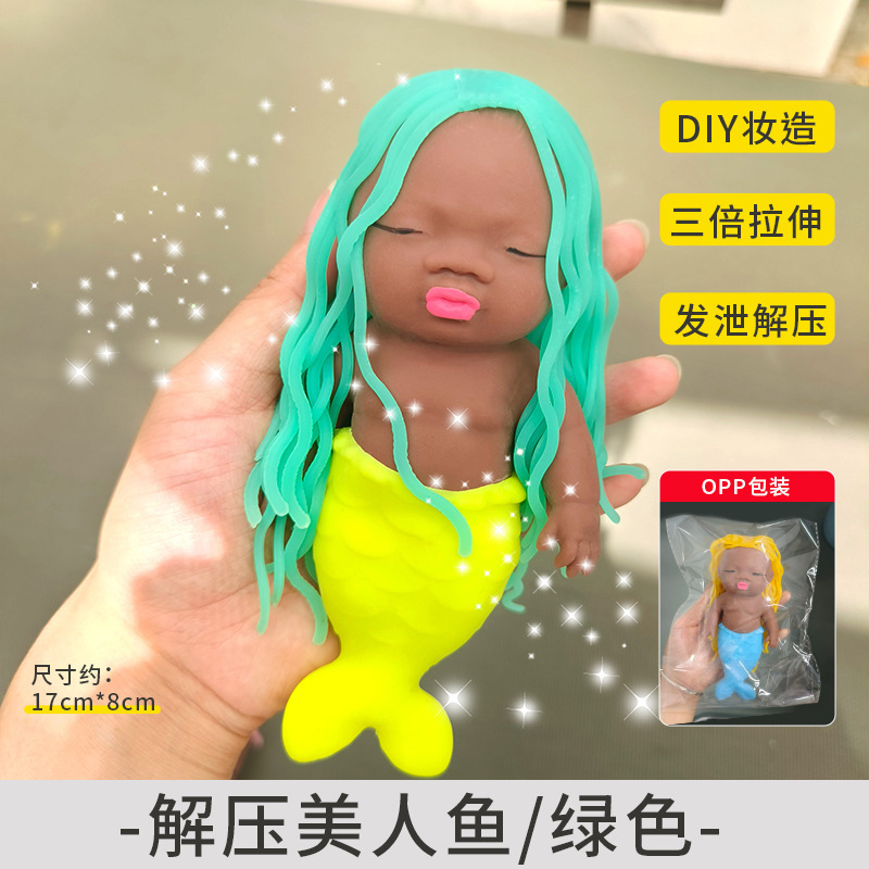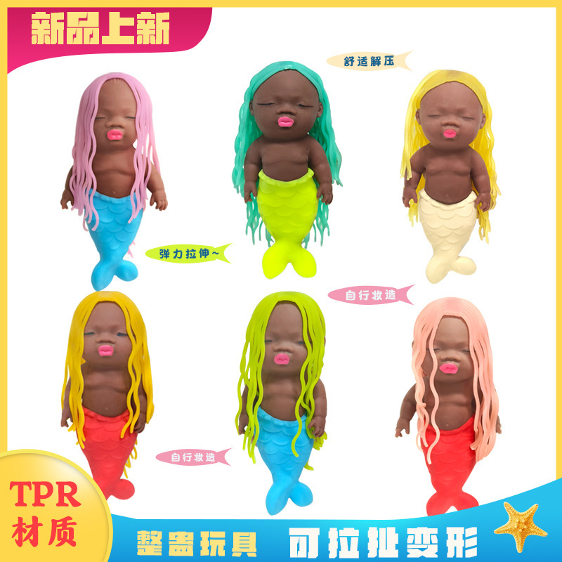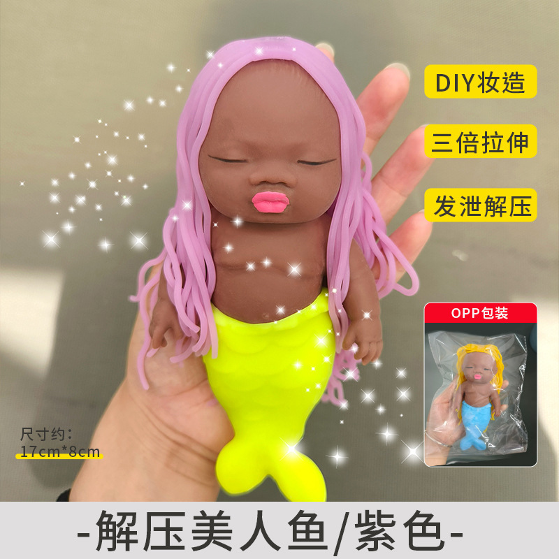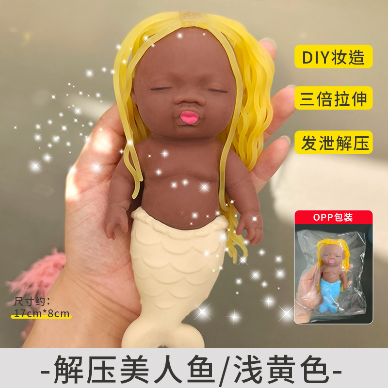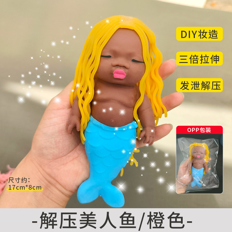 丑萌长发美人鱼公主发泄解压玩具黑色掌心娃娃软胶捏捏乐厂家批发
