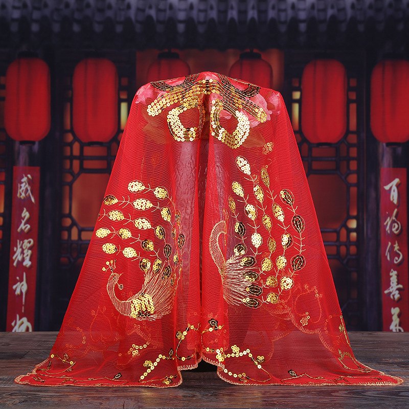新品结婚盖头新娘孔雀亮片红盖头新婚头纱大红中式拜堂盖头批发