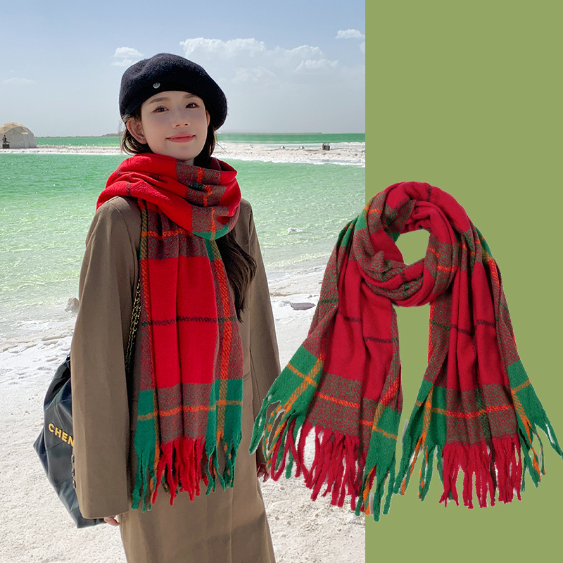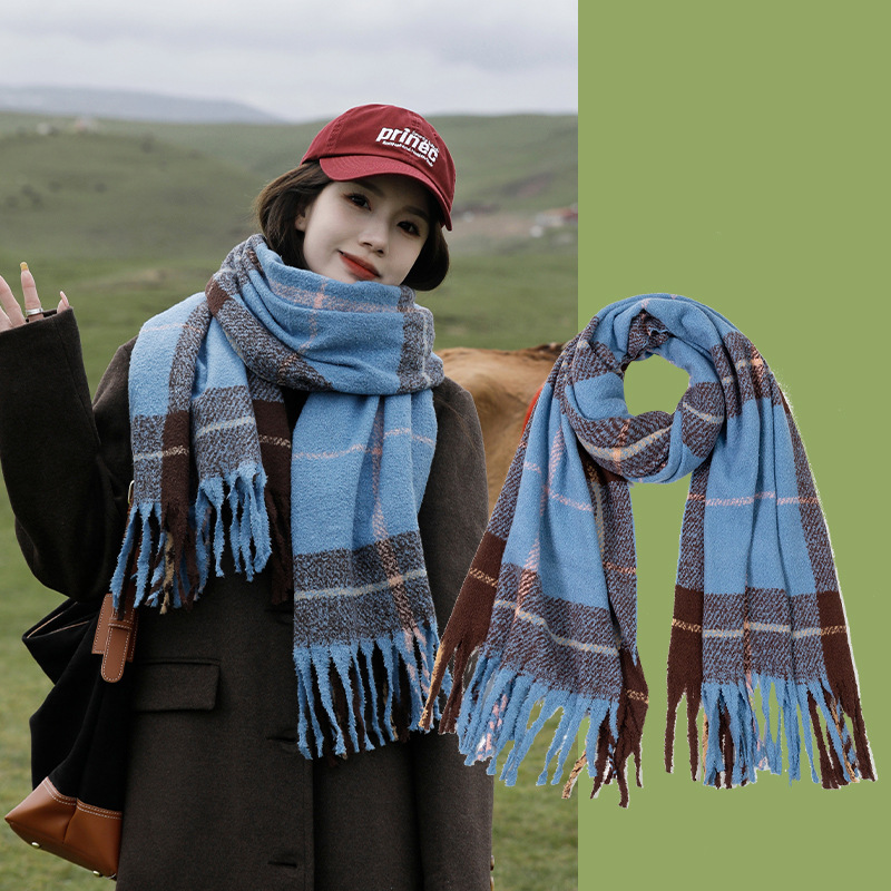 新款秋冬格子流苏百搭围巾女彩虹加厚围脖情侣披肩针织保暖披风