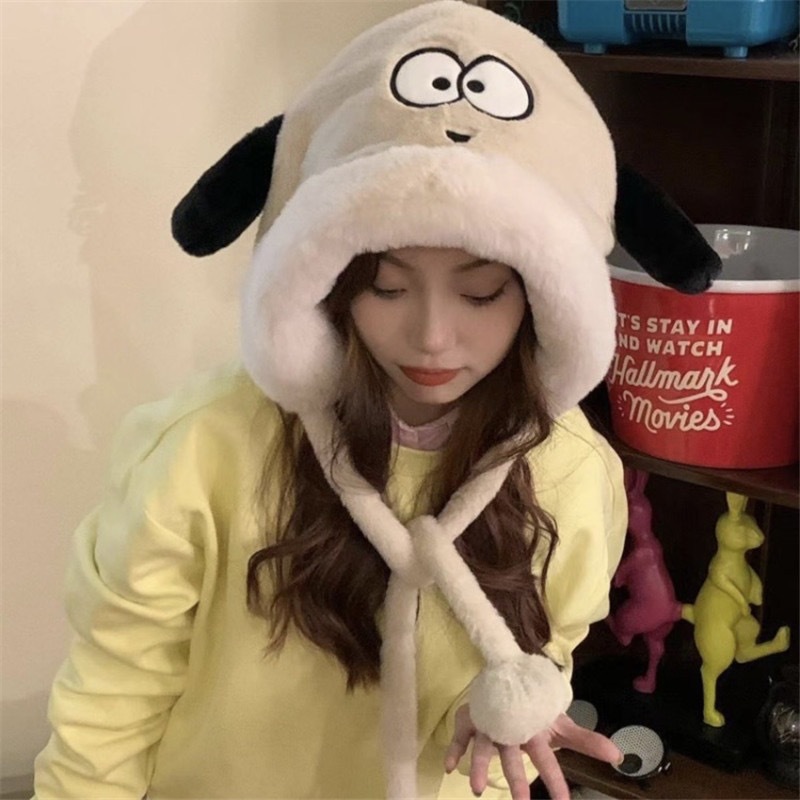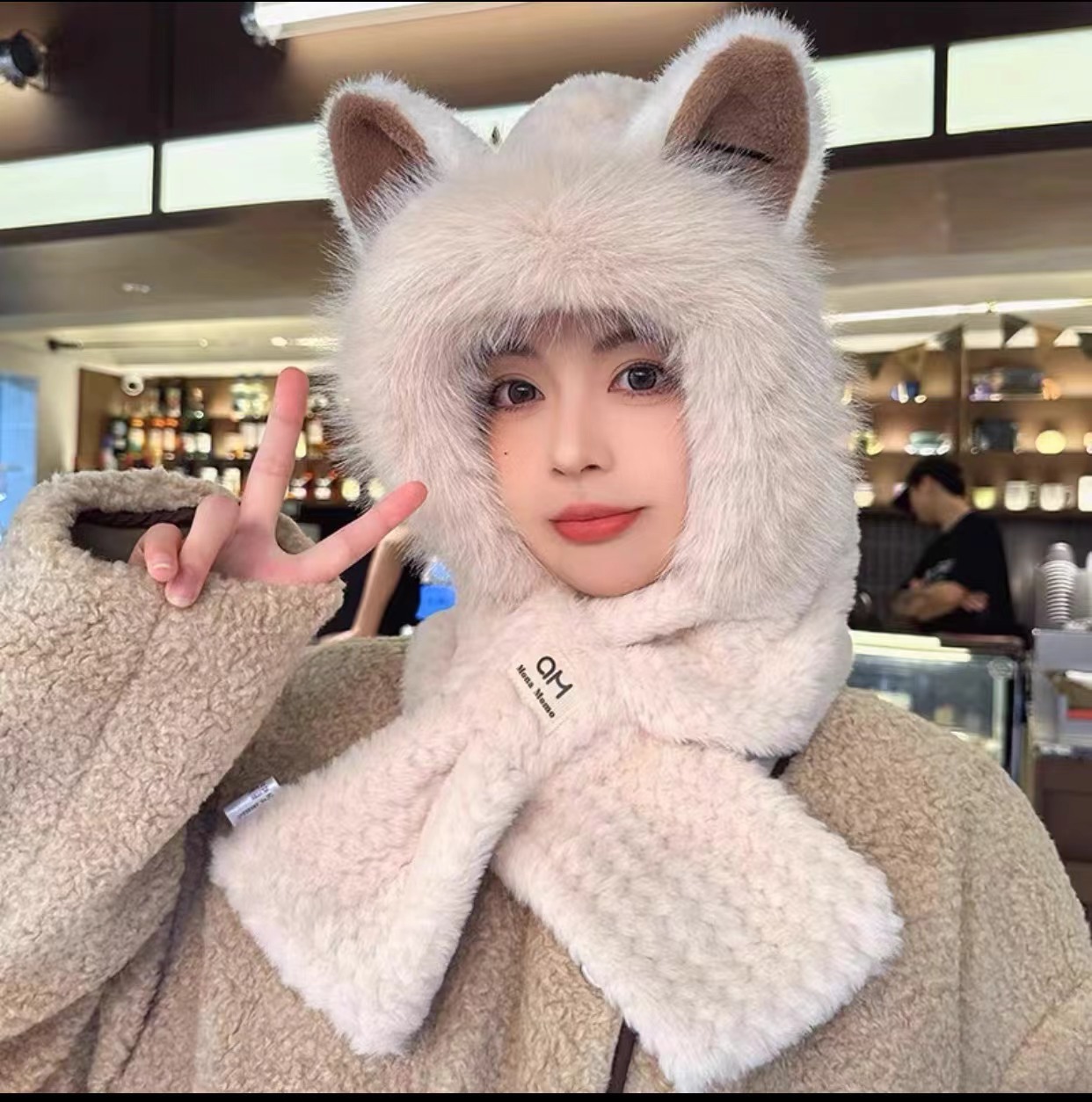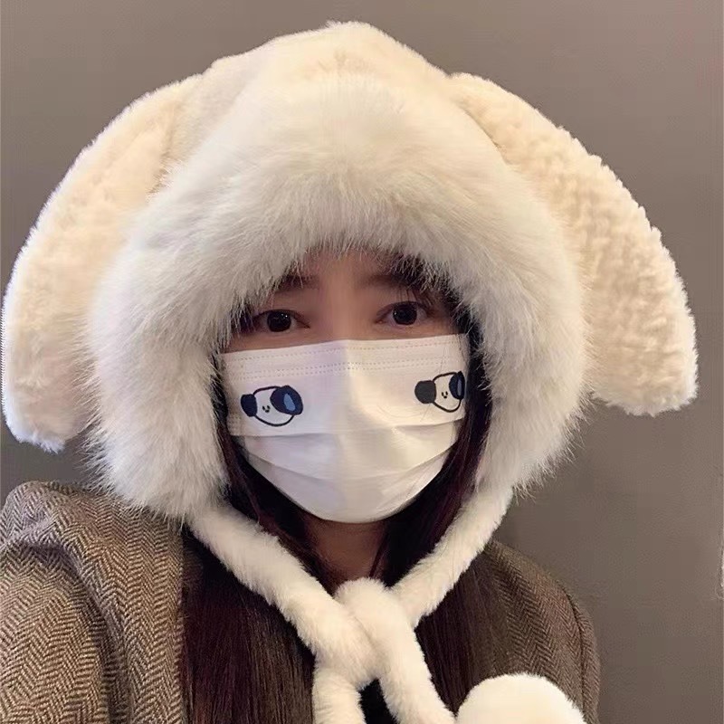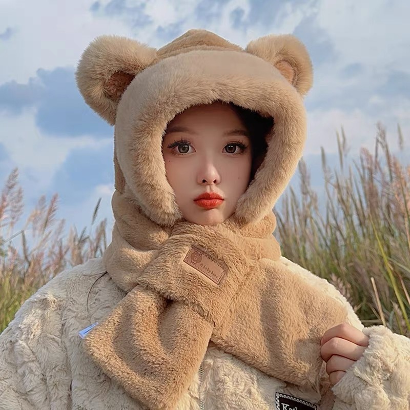 可爱狐狸耳朵帽子围巾一体女冬季毛绒加厚骑车防寒保暖围脖护耳帽