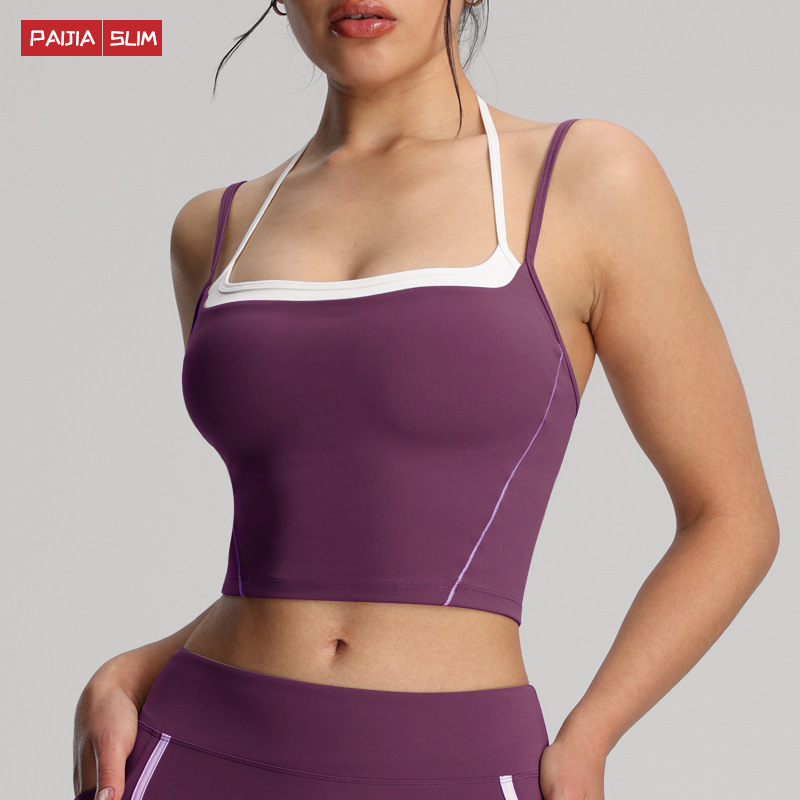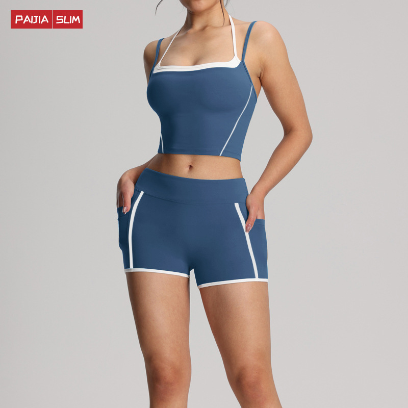 跨境撞色瑜伽服套装春夏外穿弹力健身假两件运动吊带背心三分短裤