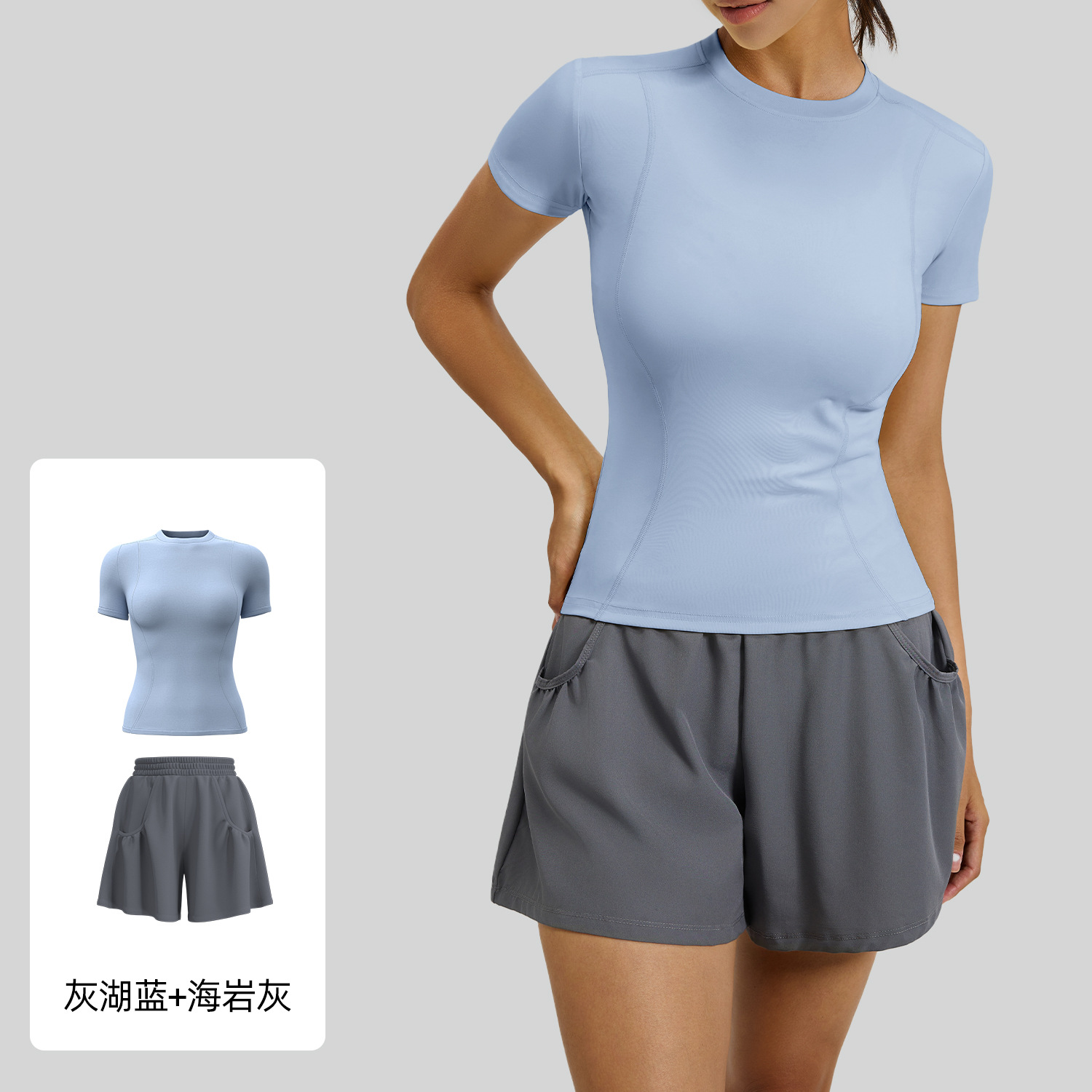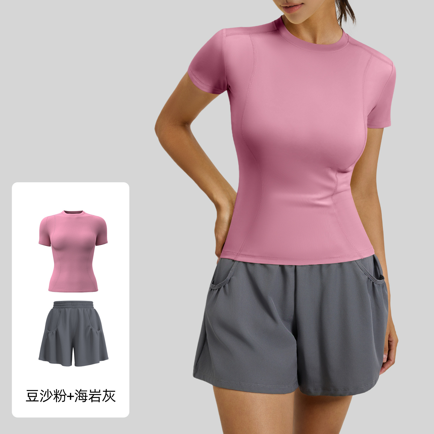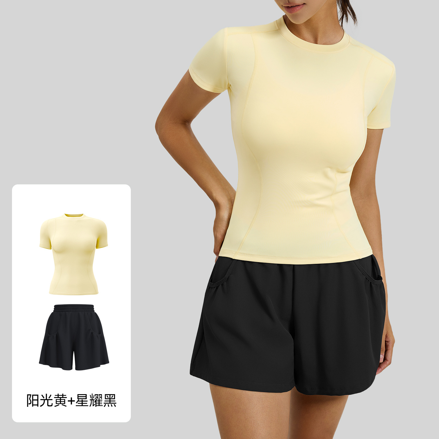 2026新款短袖欧美风纯色运动套装高腰紧身跑步提臀瑜伽健身服女