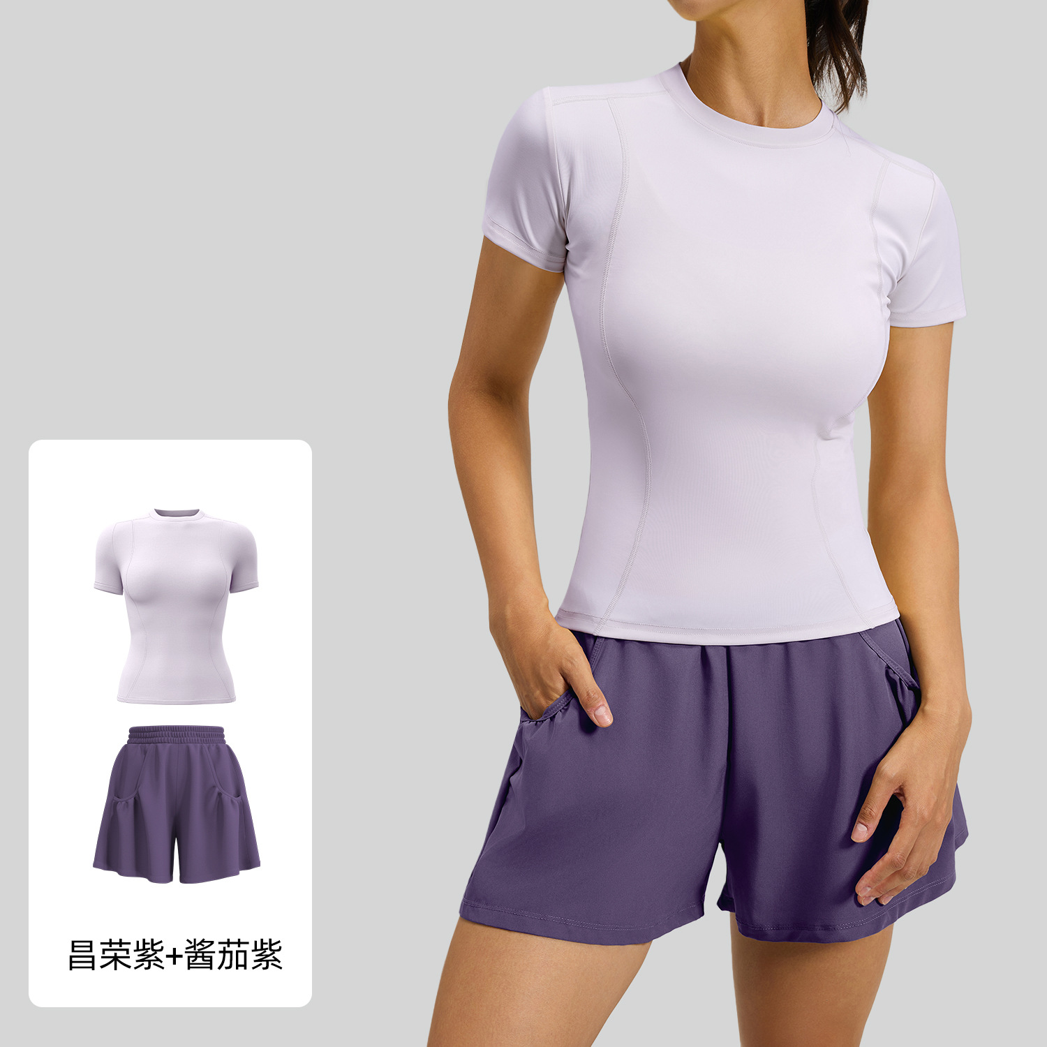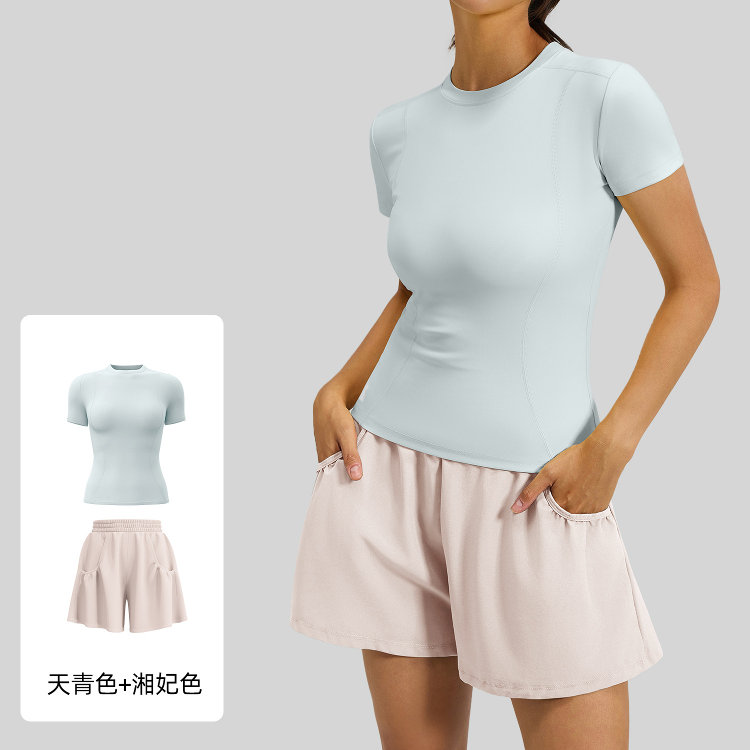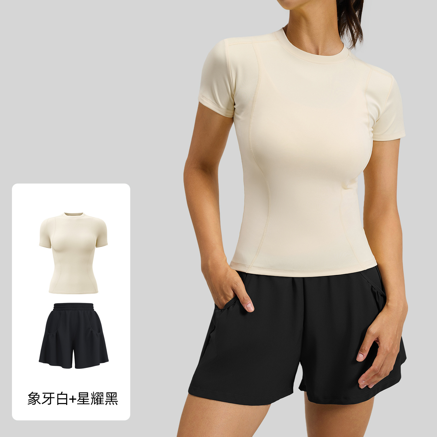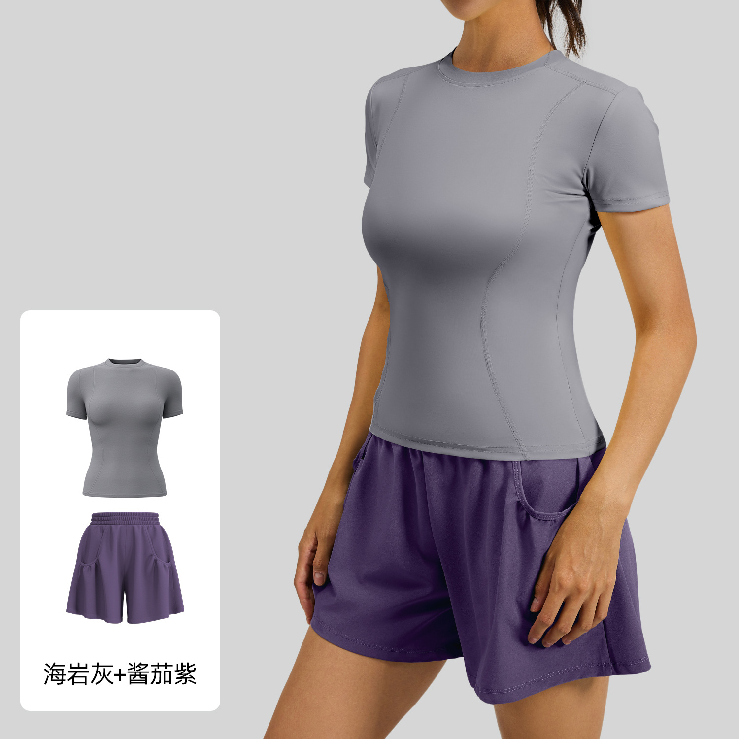 2026新款短袖欧美风纯色运动套装高腰紧身跑步提臀瑜伽健身服女