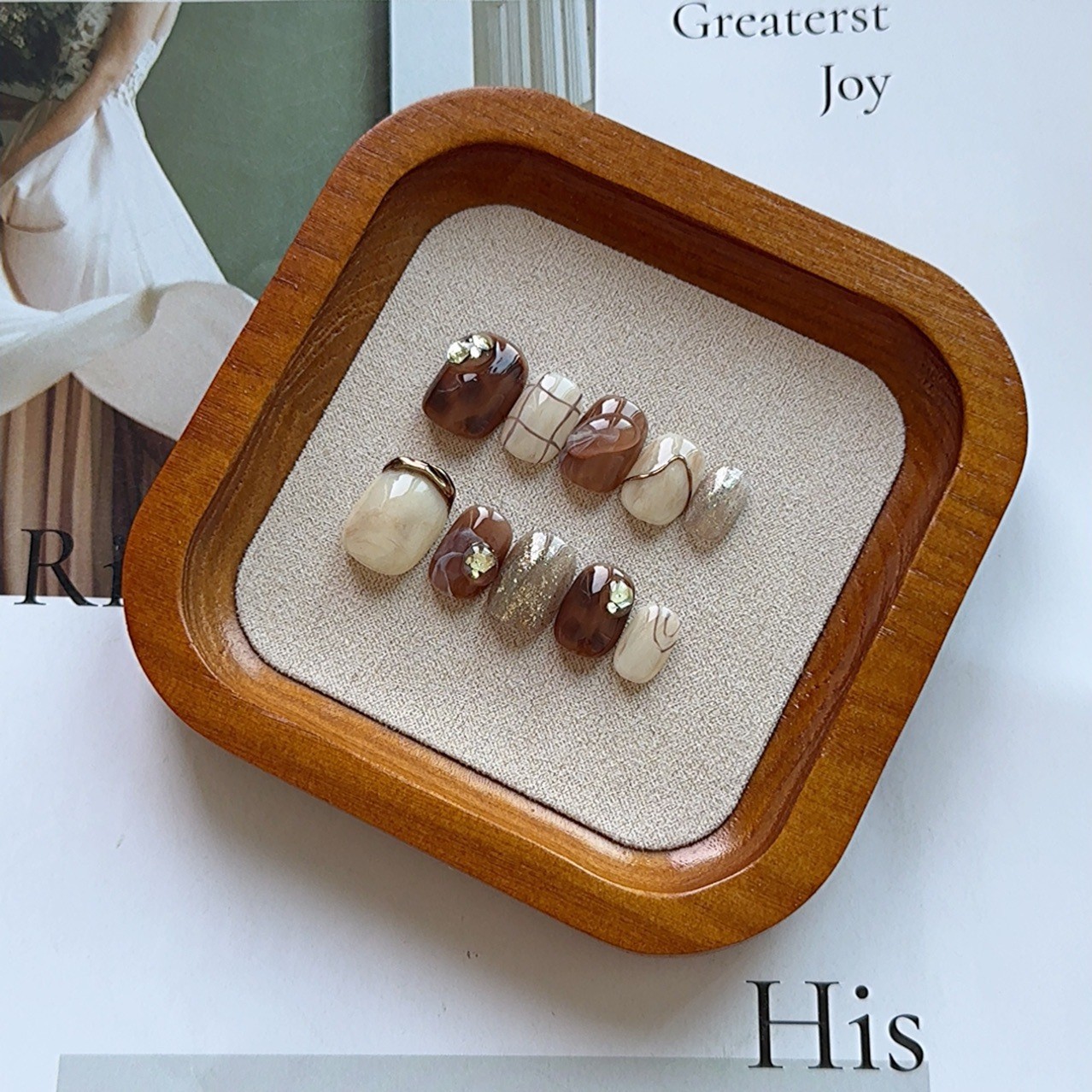 高级暖棕米配色手工穿戴甲轻奢手绘格纹造型通勤日常短款美甲成品
