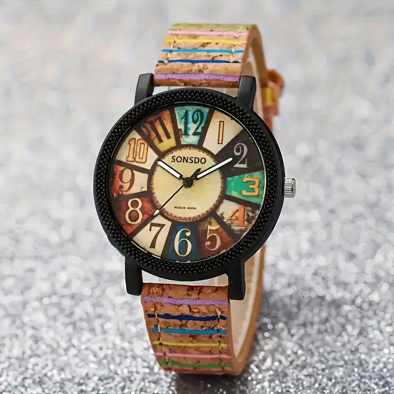 跨境爆款女士休闲木纹皮革表带大数字转盘复古条纹手表学生腕表女