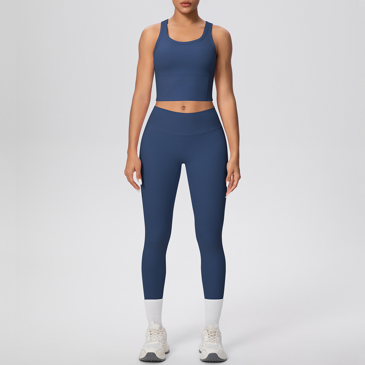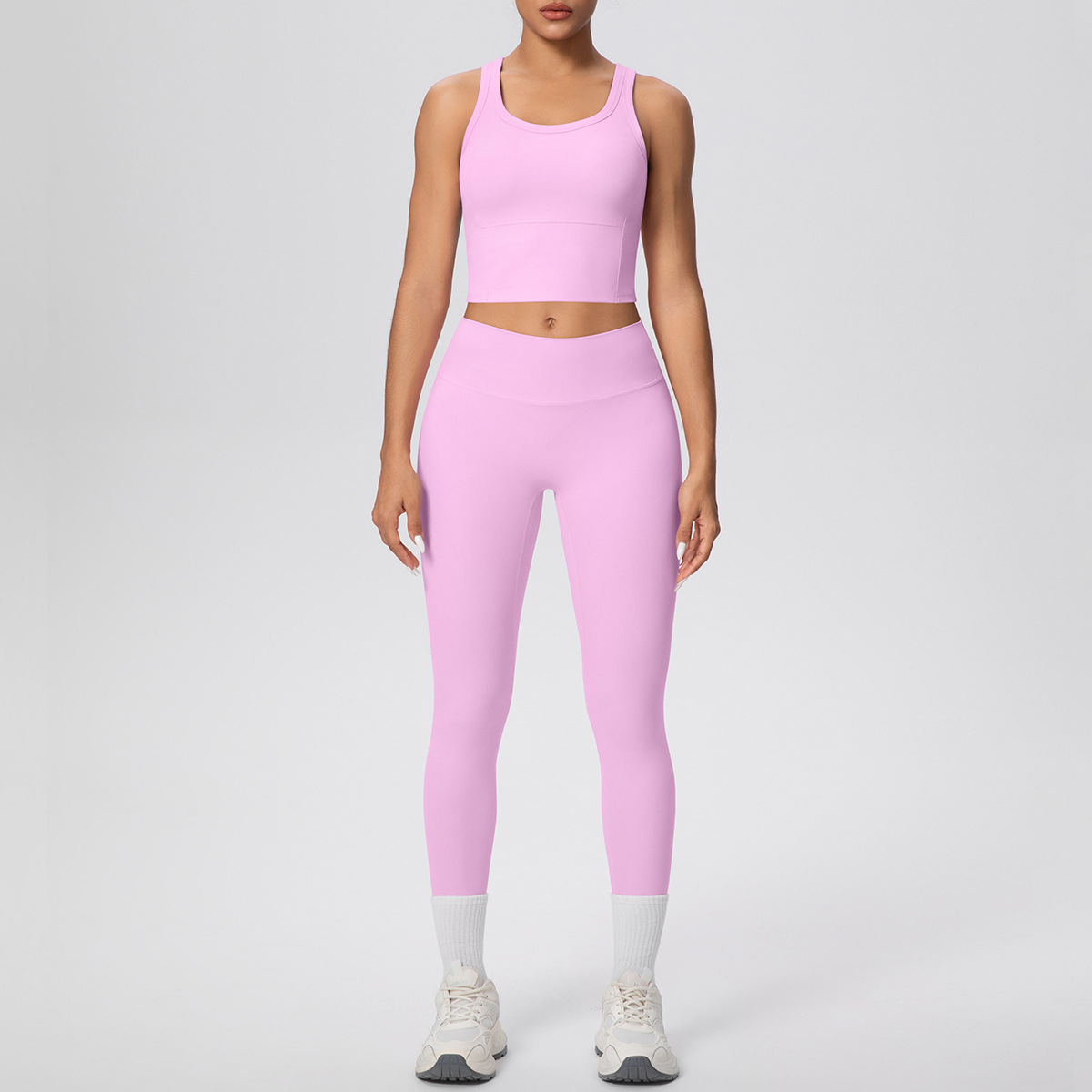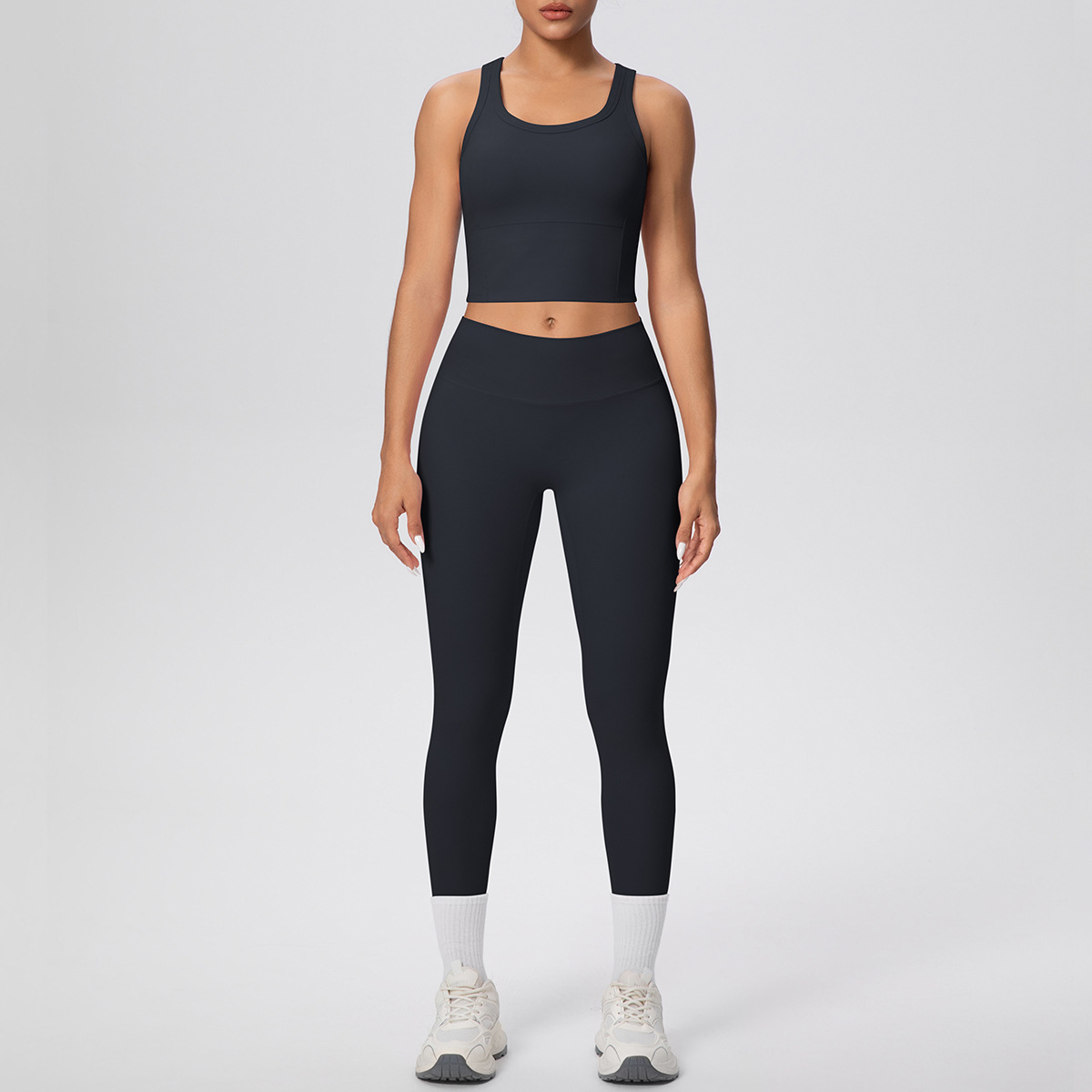 新款跨境双面磨毛纯色透气背心长款瑜伽服套装运动跑步健身两件套