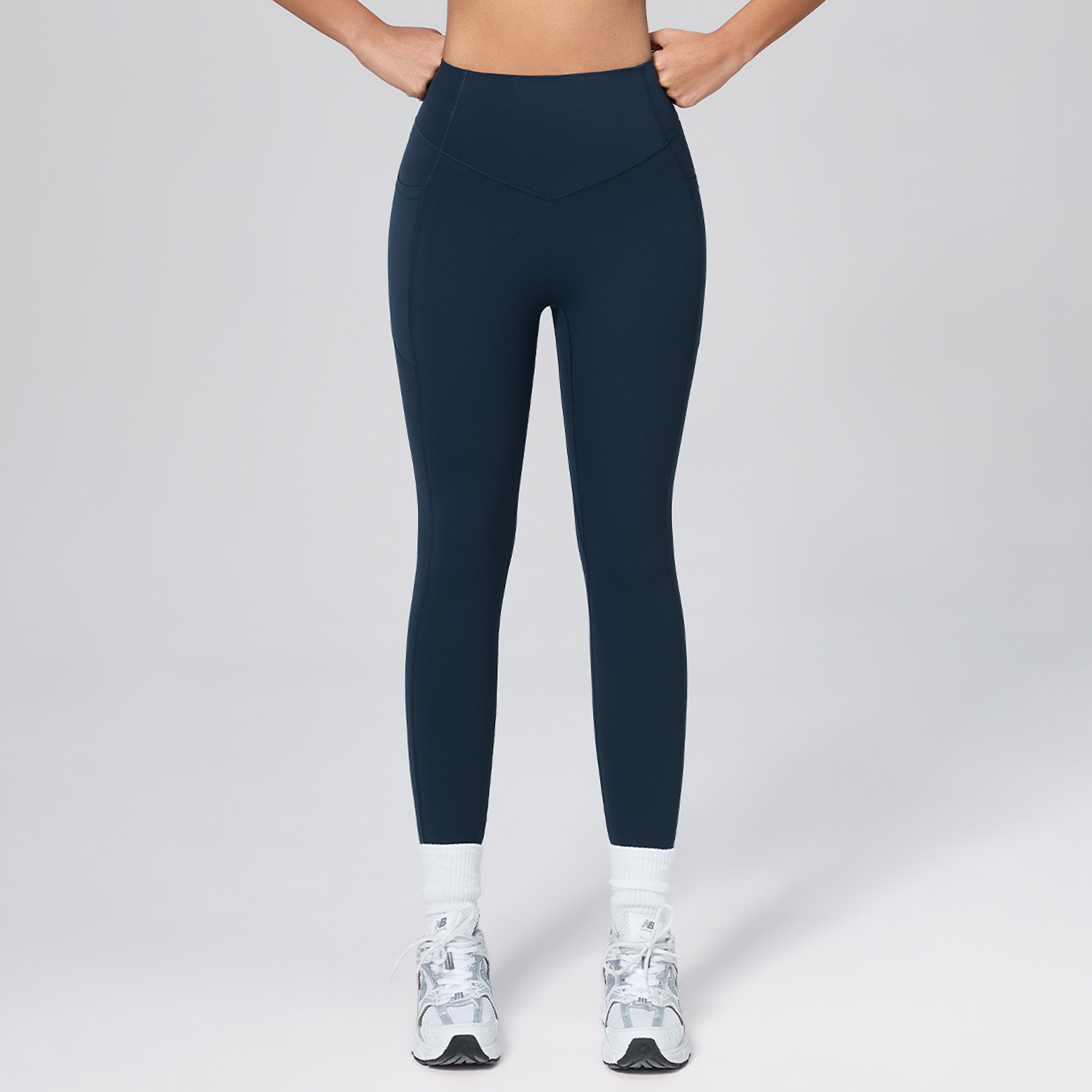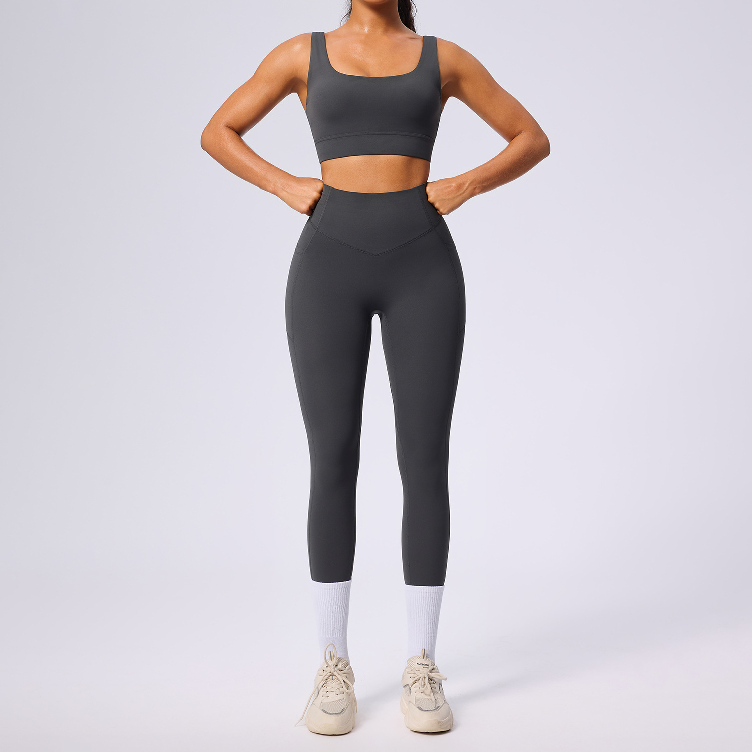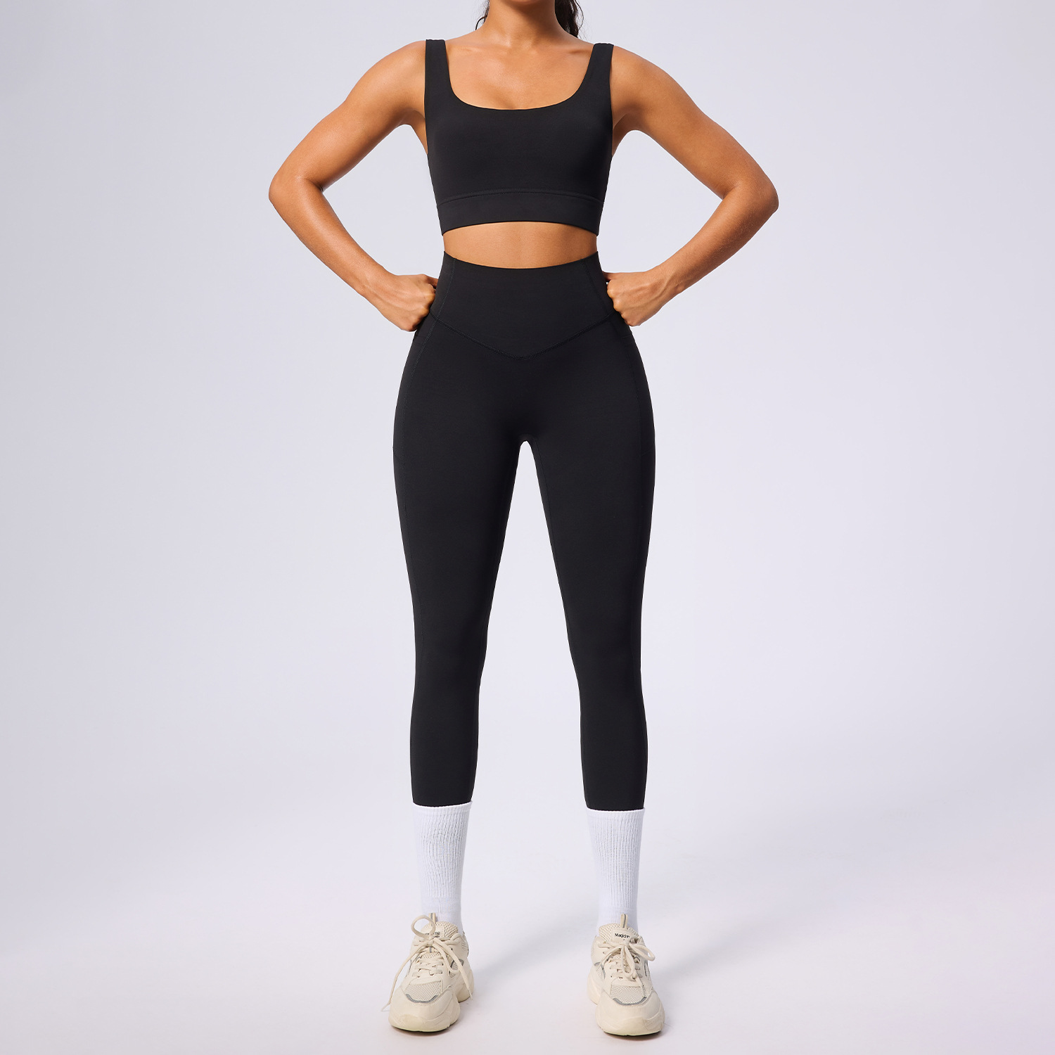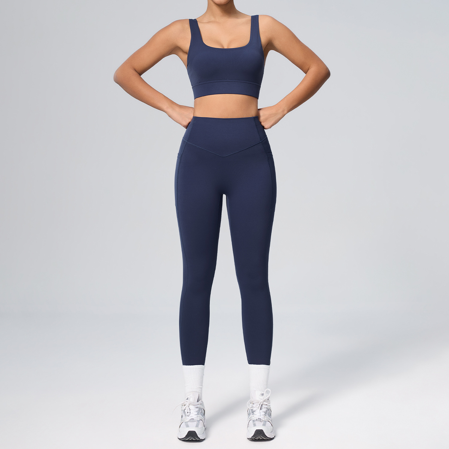 欧美新款塑身运动套装女高腰收腹口袋瑜伽服弹力透气健身服套装