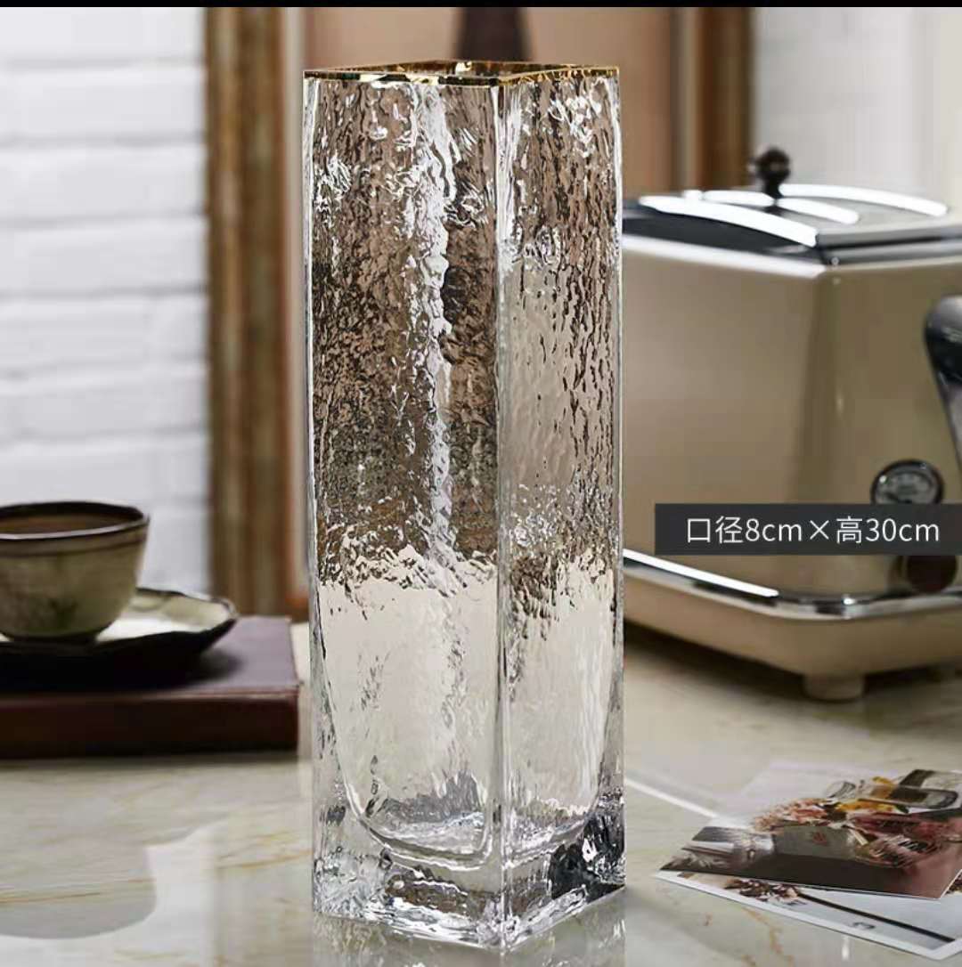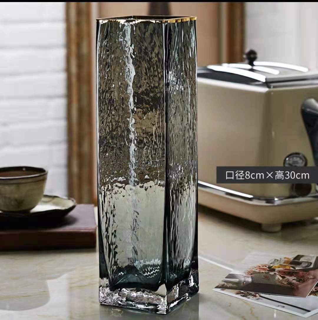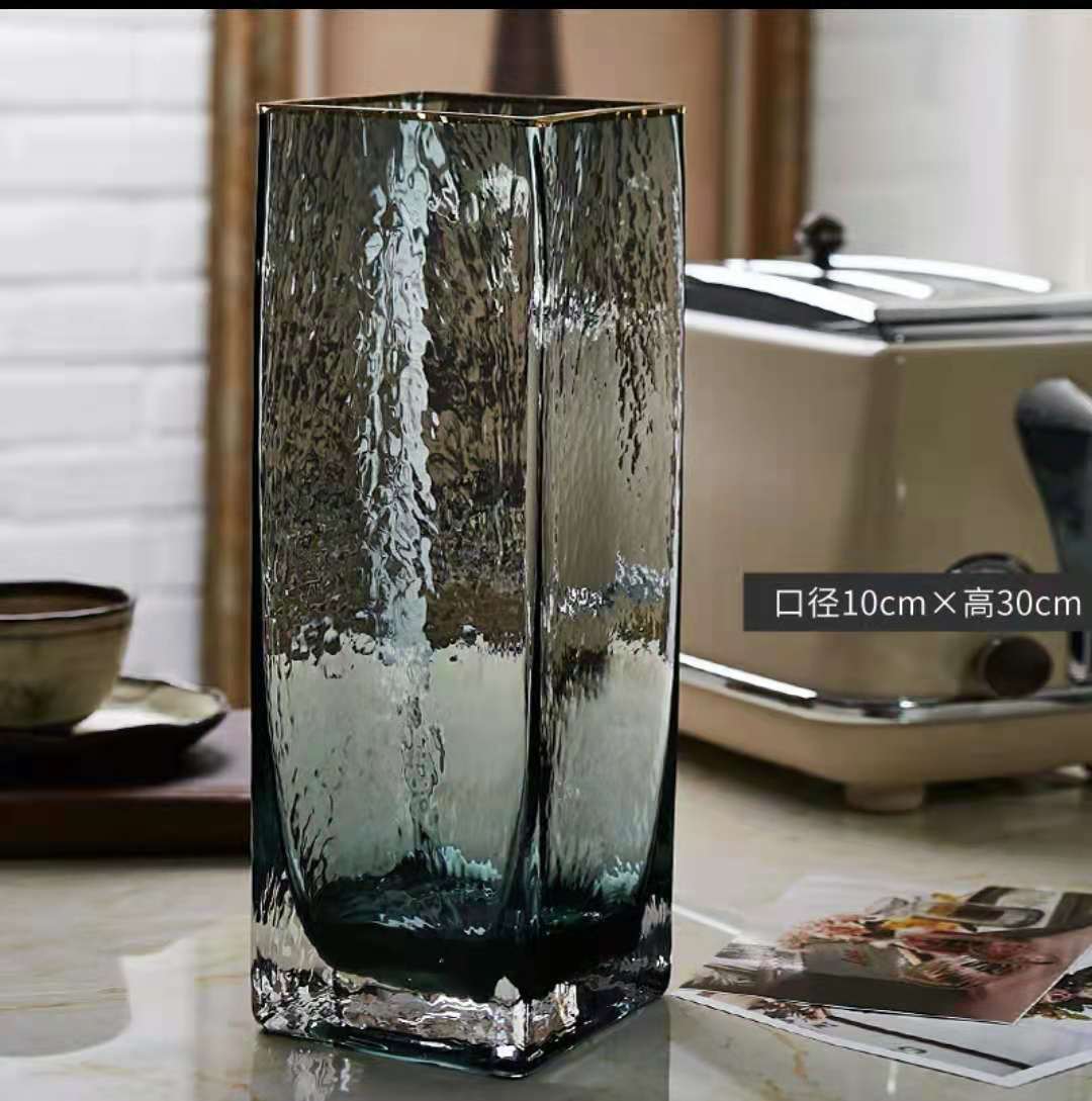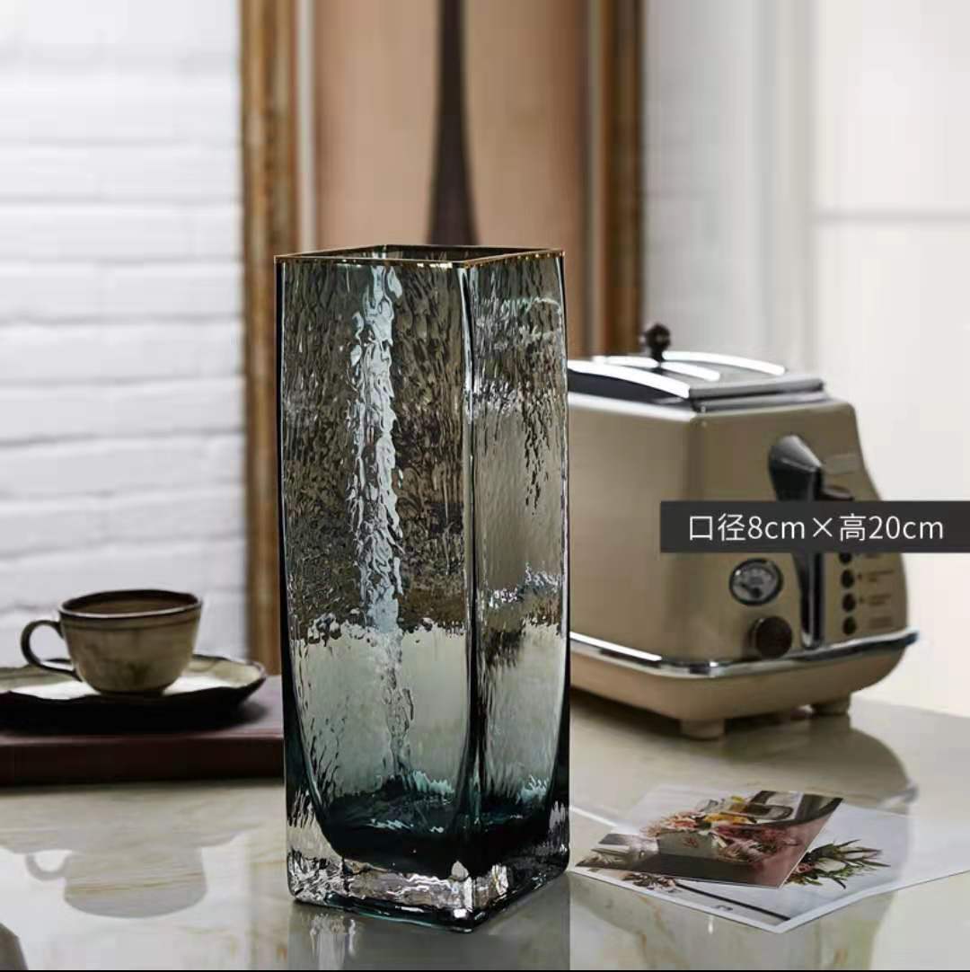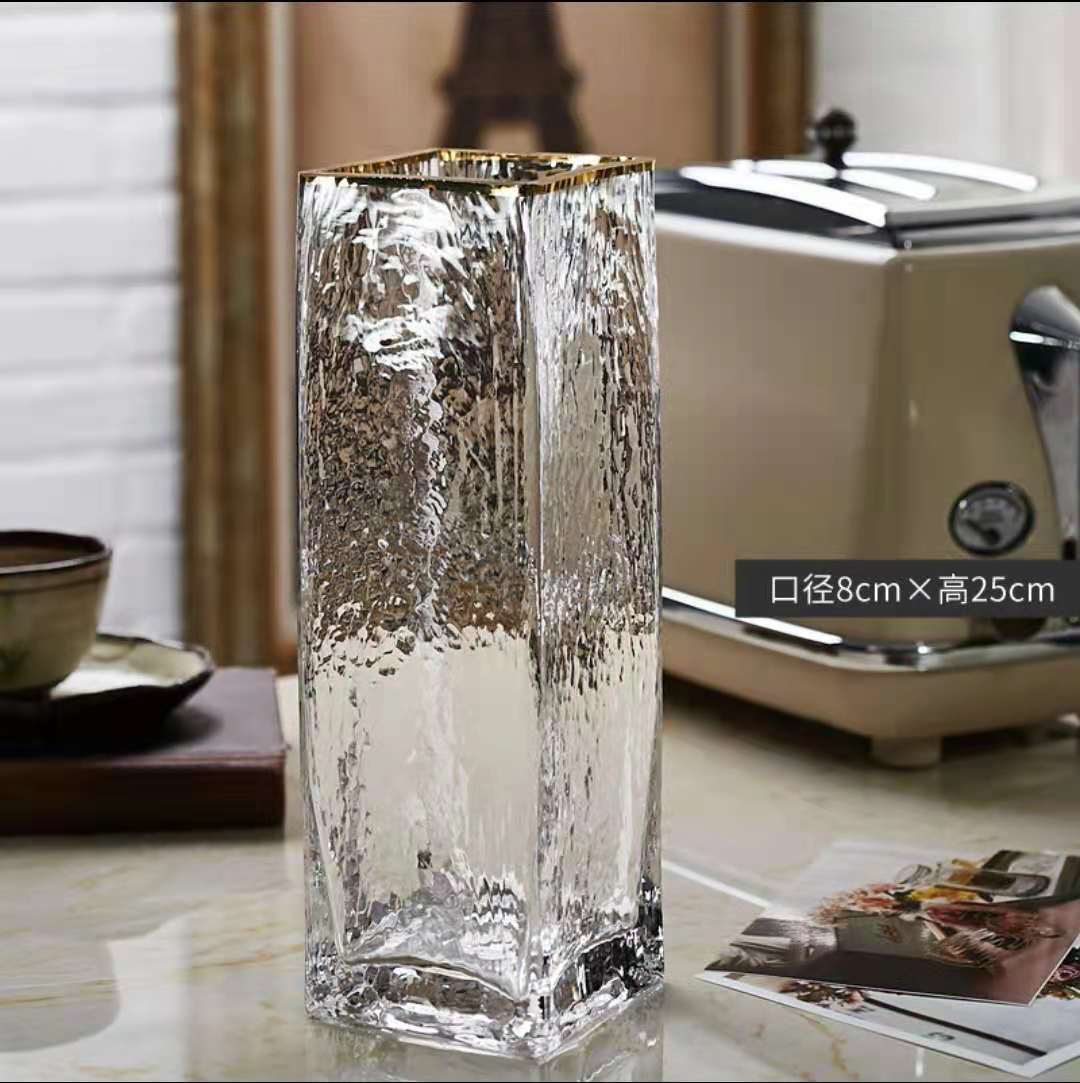 花瓶批发欧式轻奢描金玻璃花瓶透明方口水培植物鲜花插家现代简约