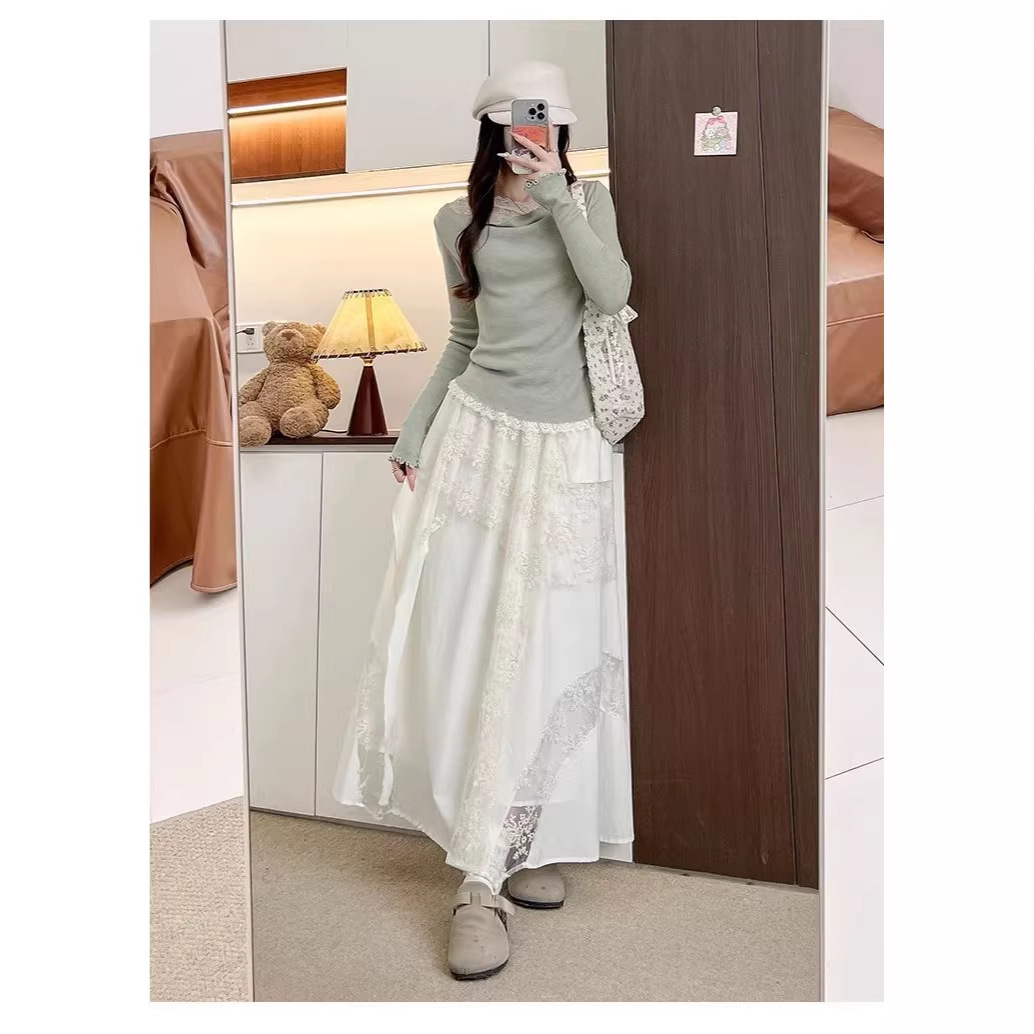 白色蕾丝拼接网纱裙女春夏新款不规则半身裙高腰显瘦温柔风长裙子