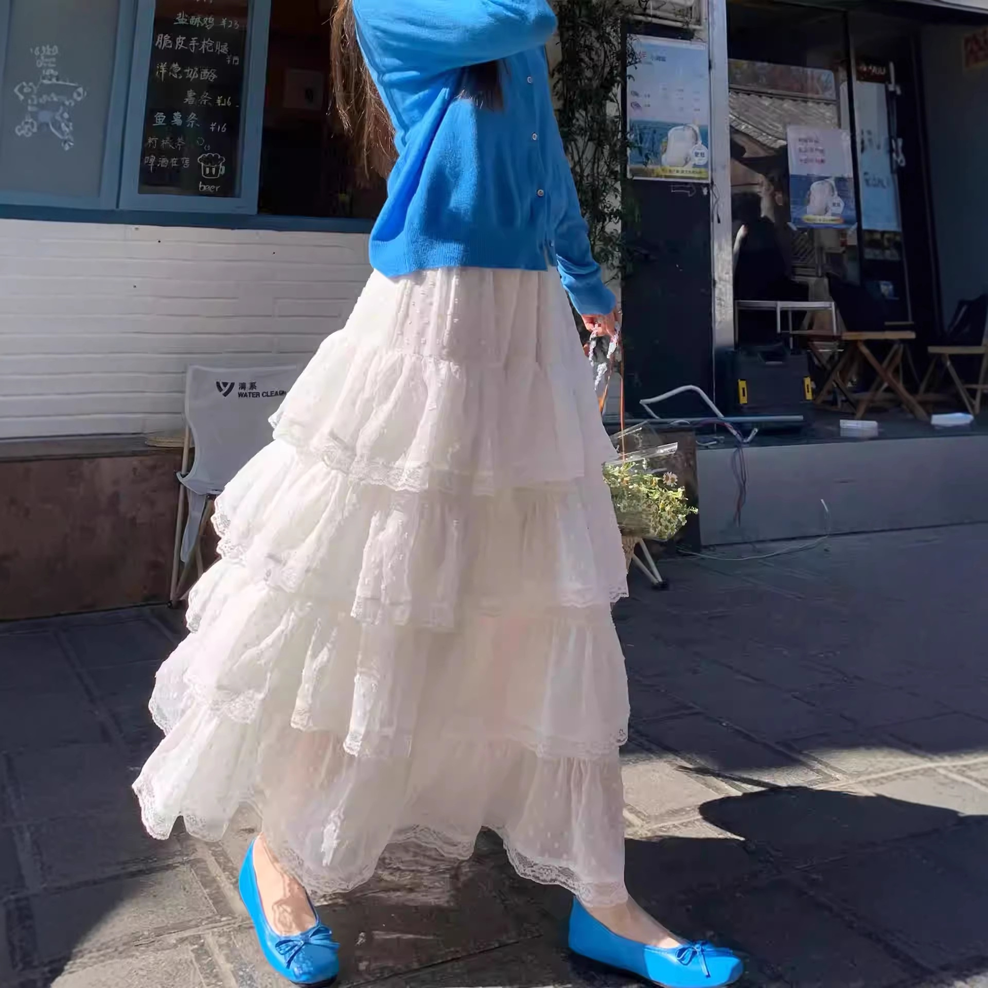 白色蛋糕裙女春夏公主裙高腰显瘦韩系多层蕾丝网纱a字蓬蓬长裙子