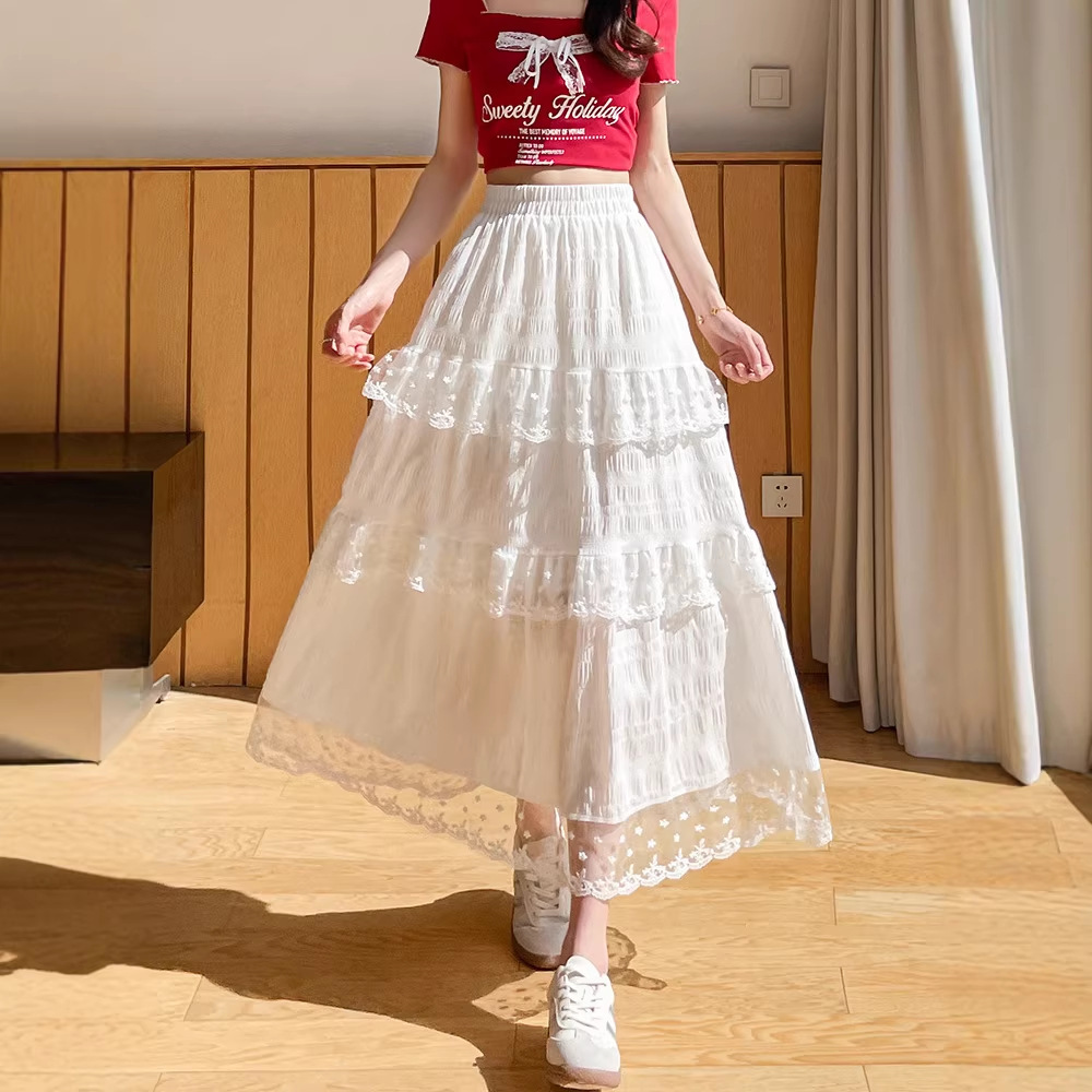 白色蕾丝蛋糕半身裙女2026新款春夏季小个子高腰a字百褶中长裙子