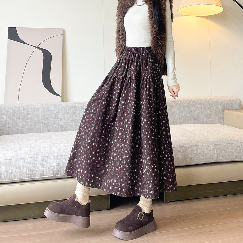 半身裙女秋冬新款蛋糕裙高腰双层显瘦复古碎花毛绒感大裙摆中长裙
