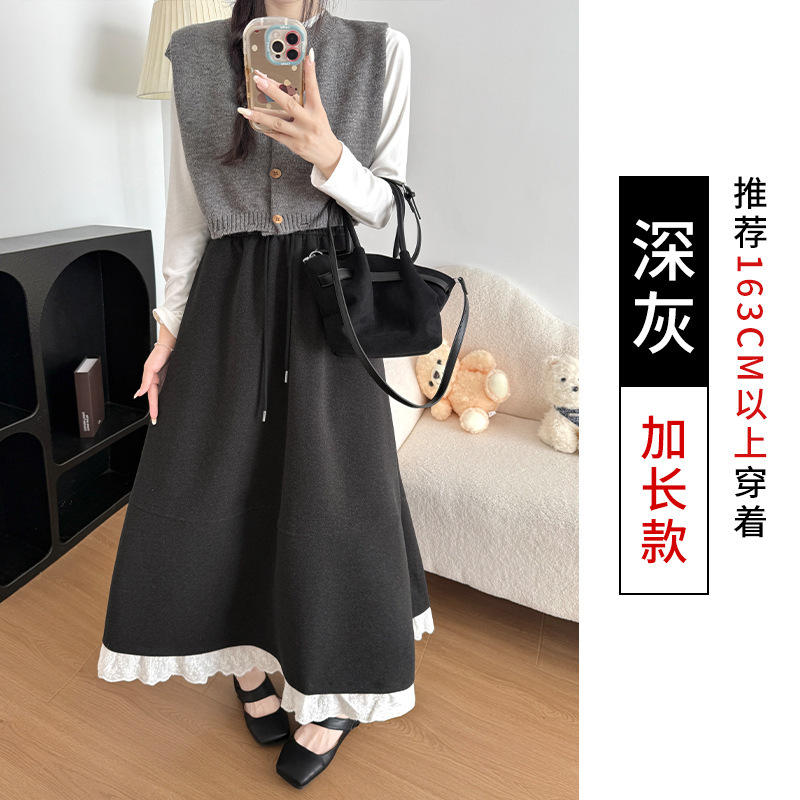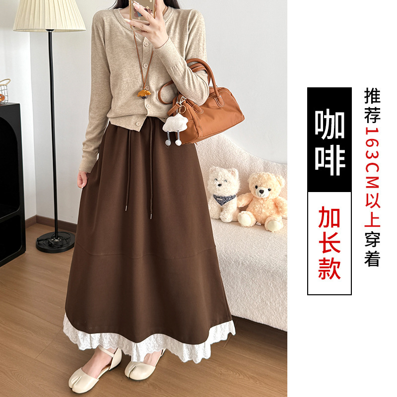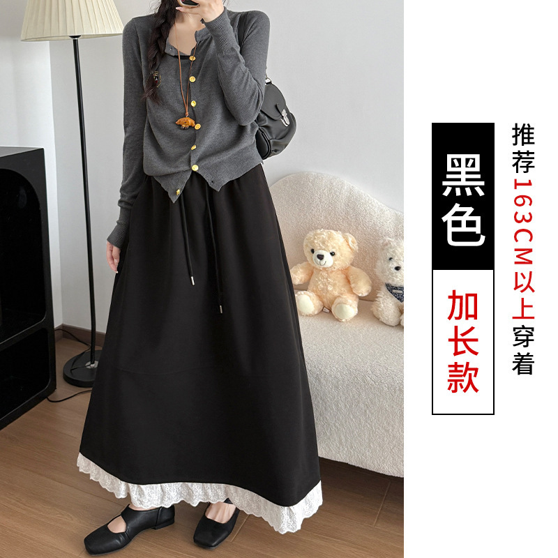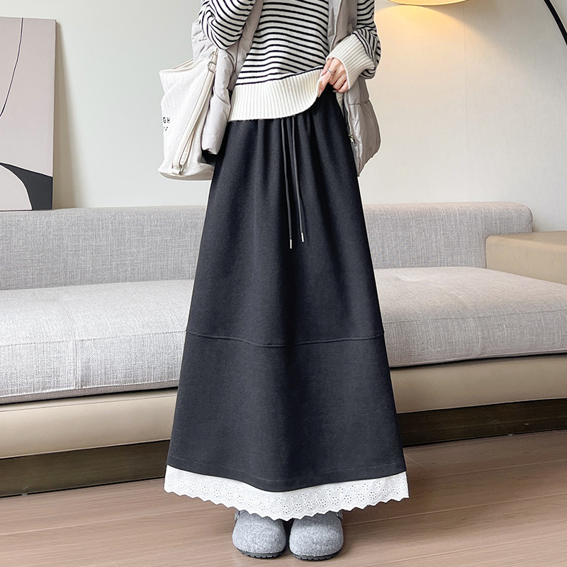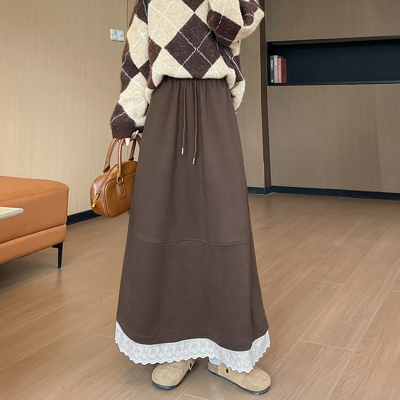 秋冬新款毛呢半身裙女蕾丝花边高腰显瘦a字大摆裙大码抽绳款裙子