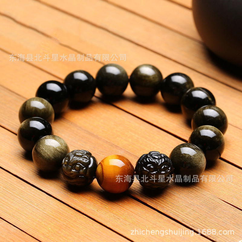 天然金曜石双貔貅圆球形皮休男女士款冰种黑曜石加黄红虎眼石手链