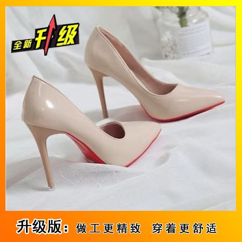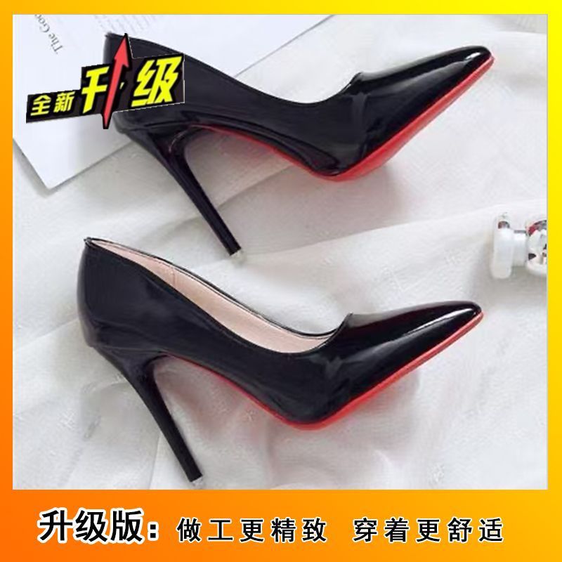 黑色漆皮工作单鞋女欧美尖头浅口细跟性感红底高跟鞋2025春秋新款