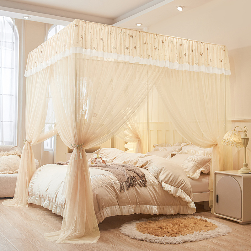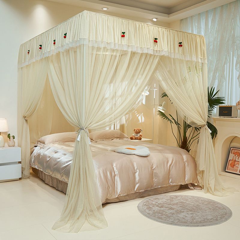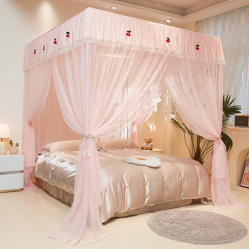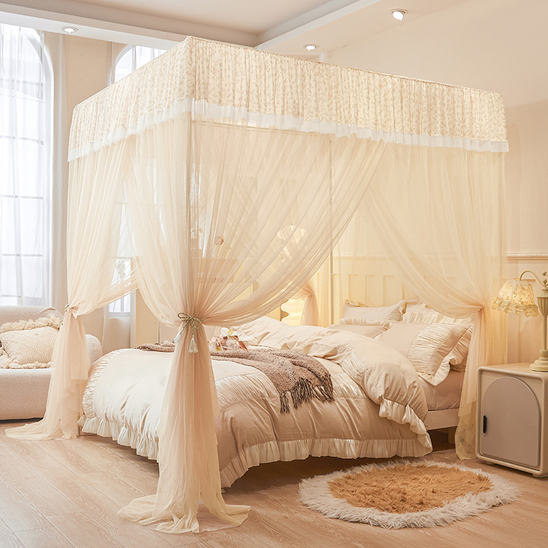 纯色简约公主风蕾丝花边三开门落地蚊帐家用卧室加密加厚加高蚊帐